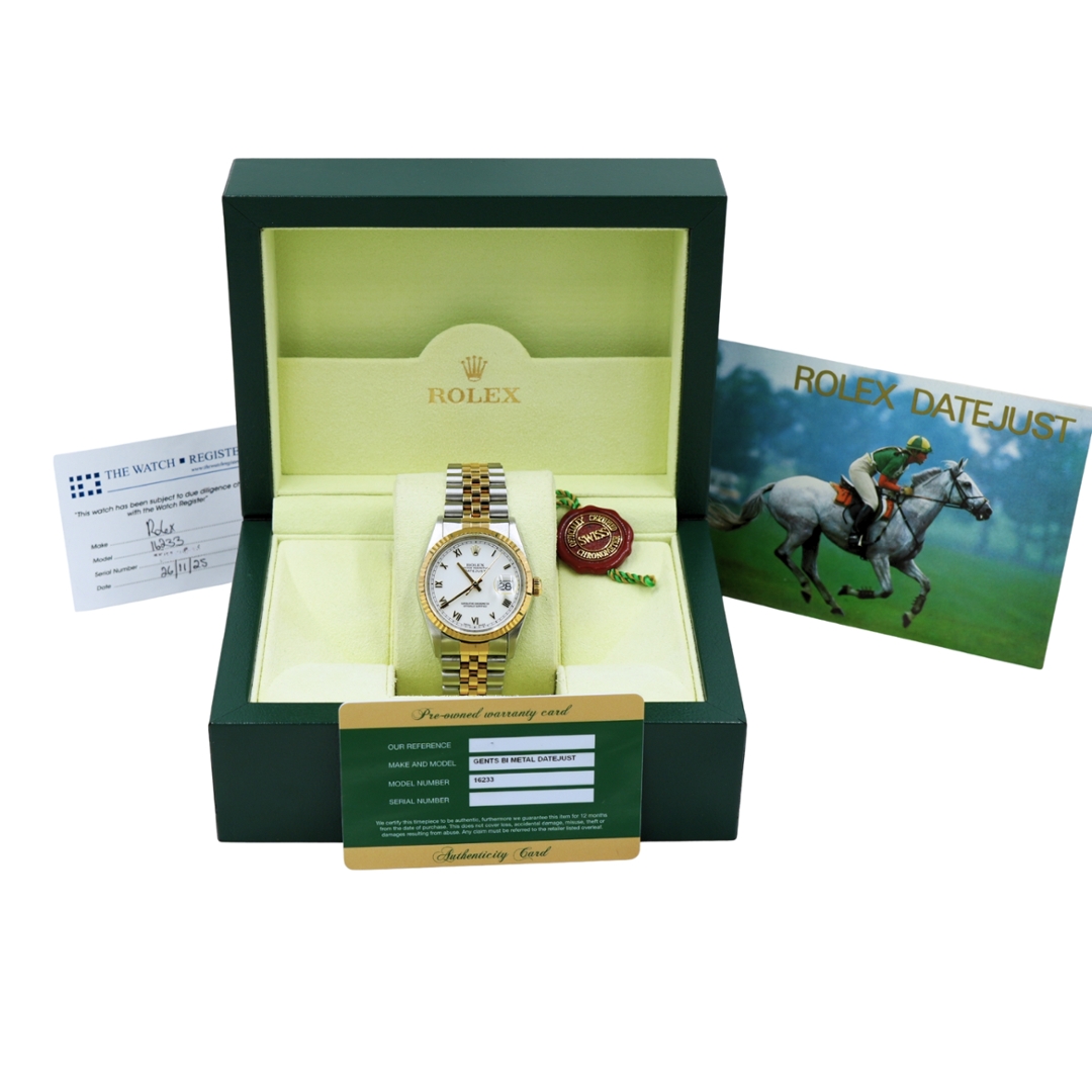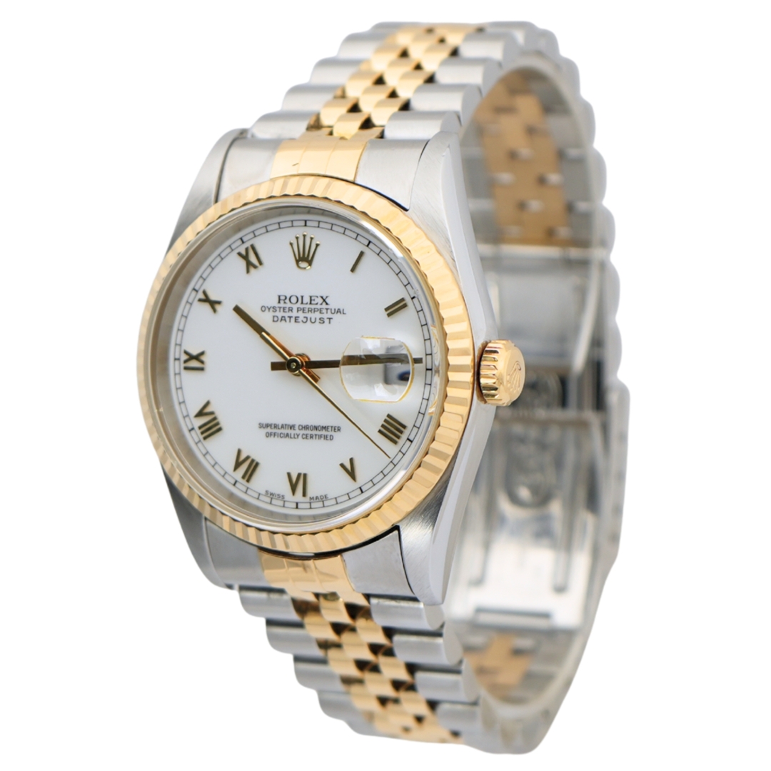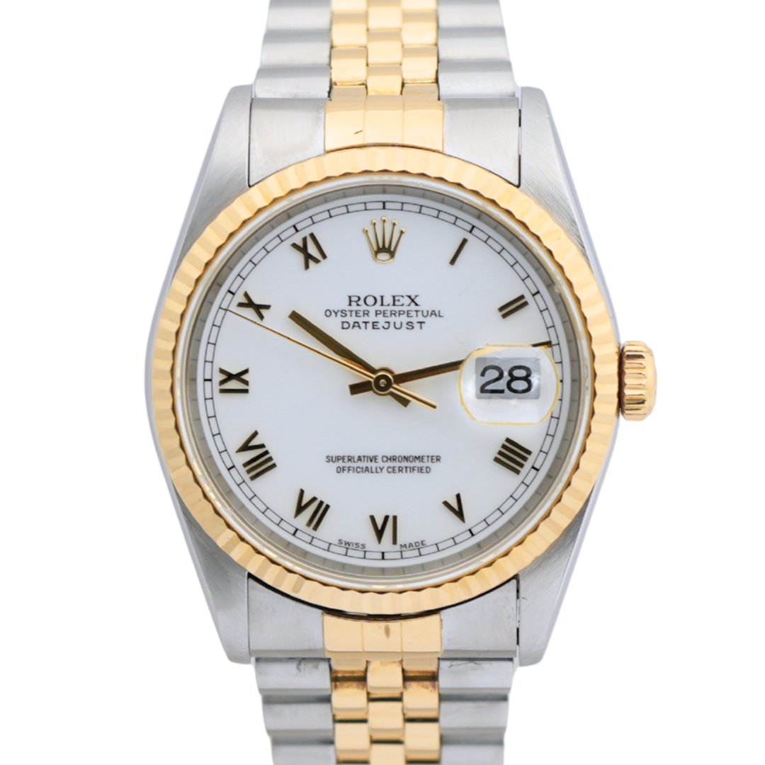A Rolex Datejust 16233 embodies timeless sophistication. It features a 36mm case crafted from stainless steel and 18ct yellow gold. Its signature fluted bezel in solid yellow gold frames a white dial set with roman numeral hour markers—an elegant contrast that elevates this bi-metal classic. As a cornerstone of the Datejust collection, this reference offers enduring appeal with a refined, confident presence on the wrist.