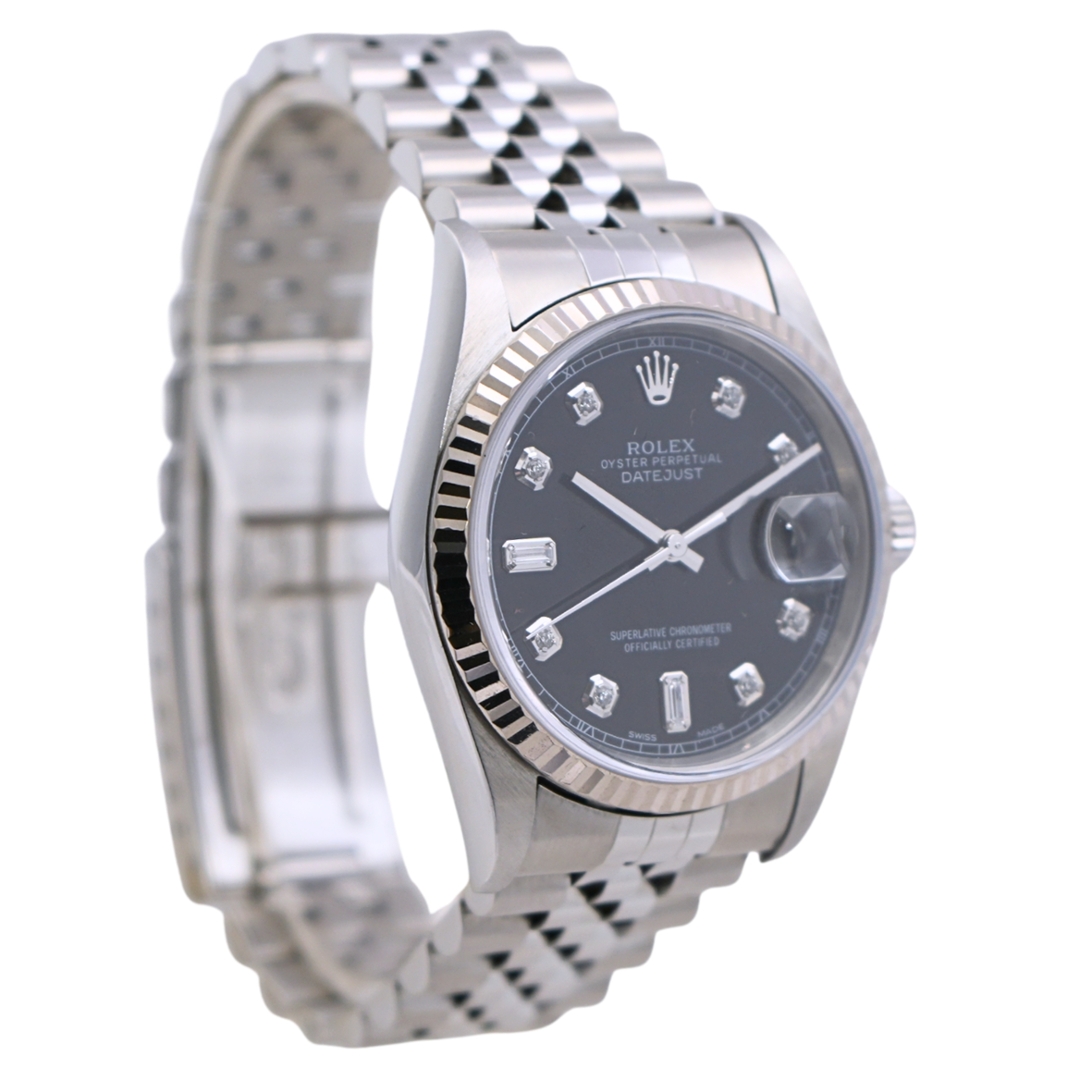 A Rolex Datejust Watch, Stainless Steel with an 18ct White Gold Fluted Bezel and an Afterset Black Dial with Diamond Numerals.