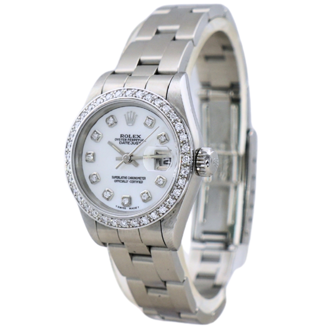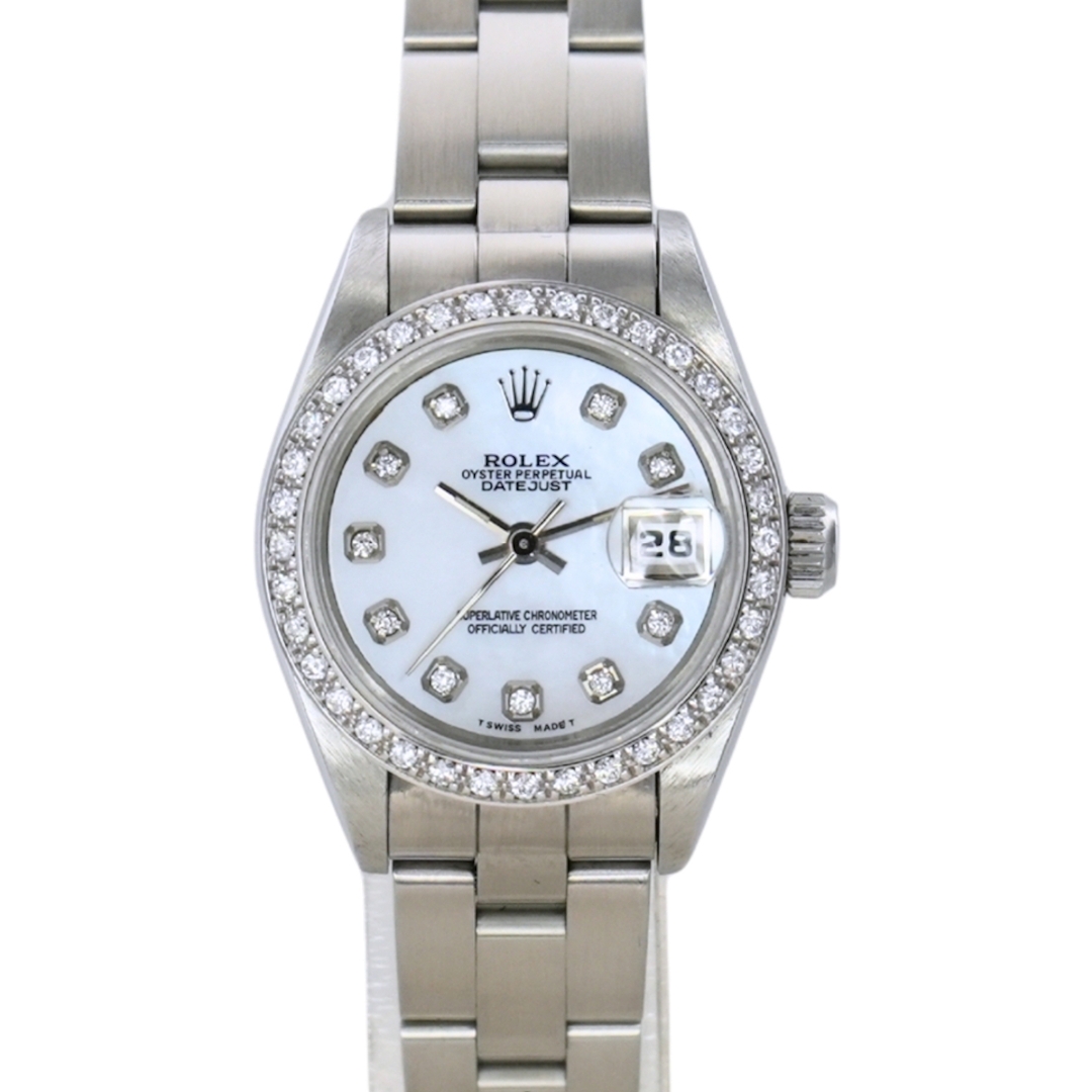 A Rolex Datejust 69190, crafted in stainless steel and upgraded with an afterset diamond bezel and afterset white mother of pearl dial, featuring brilliant-cut diamond hour markers — an elegant and eye-catching update to one of Rolex’s most enduring references. Sized at 26mm, this classic Lady-Datejust features a timeless profile with modern sparkle, making it ideal for both daily elegance and special occasions.