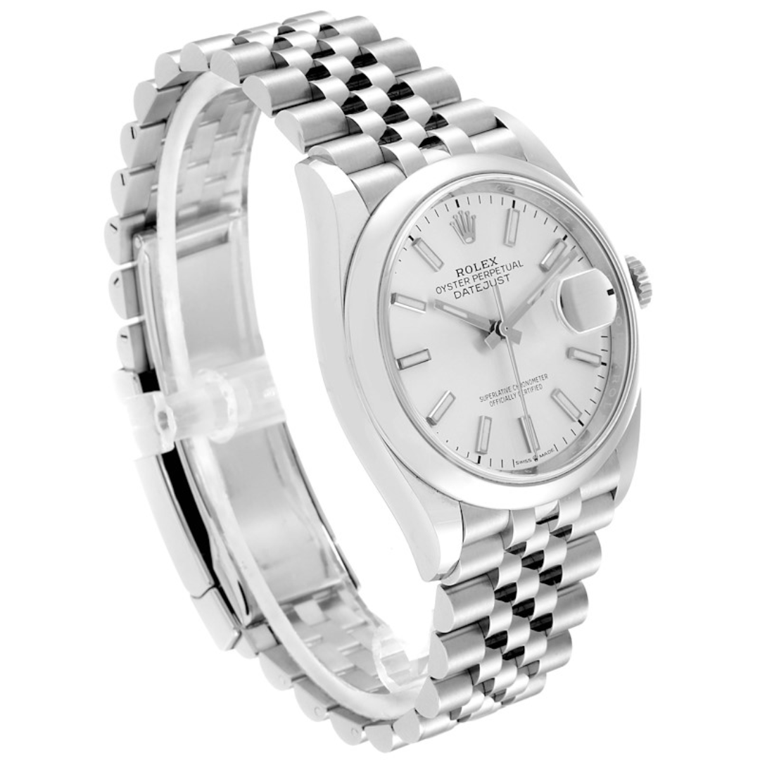 This 2025 Rolex Datejust 36 pairs a stainless steel Oyster case with a clean, understated silver dial, giving the watch a classic, versatile presence. The 36mm profile retains the traditional proportions of the Datejust line, while the luminous baton hour markers and smooth steel bezel offer a contemporary feel. Powered by the automatic Calibre 3235 movement, it delivers excellent precision and robust performance suited to daily wear.
