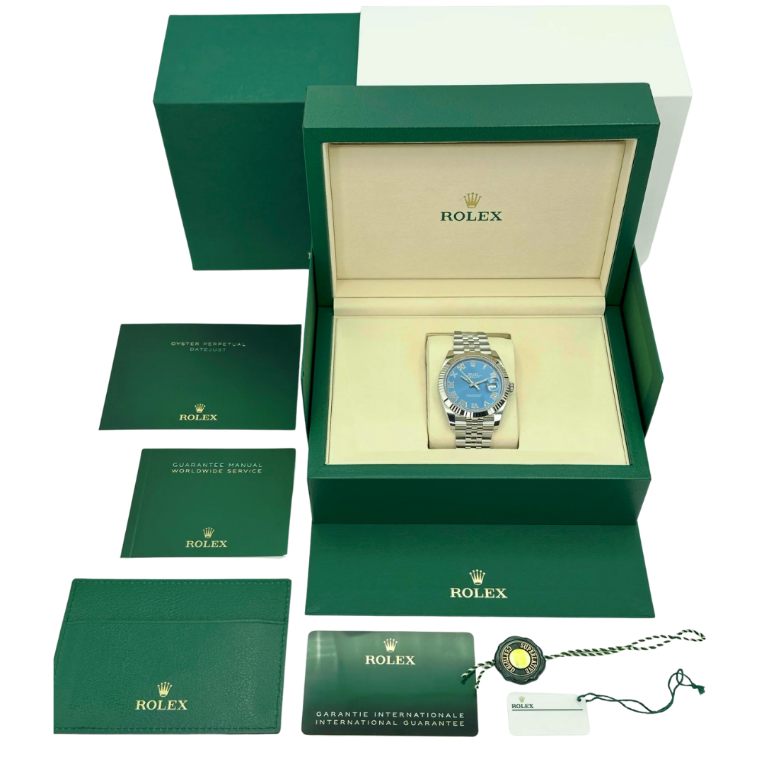 Inside the 126300 sits the Rolex Calibre 3235 automatic movement, a state-of-the-art engine delivering exceptional precision, improved efficiency and an extended power reserve. This movement is known for its reliability and performance, making the Datejust 41 an ideal choice for anyone wanting a luxury watch that can be worn without compromise. The smooth steel bezel keeps the design clean and modern, allowing the vibrant blue dial to take centre stage.