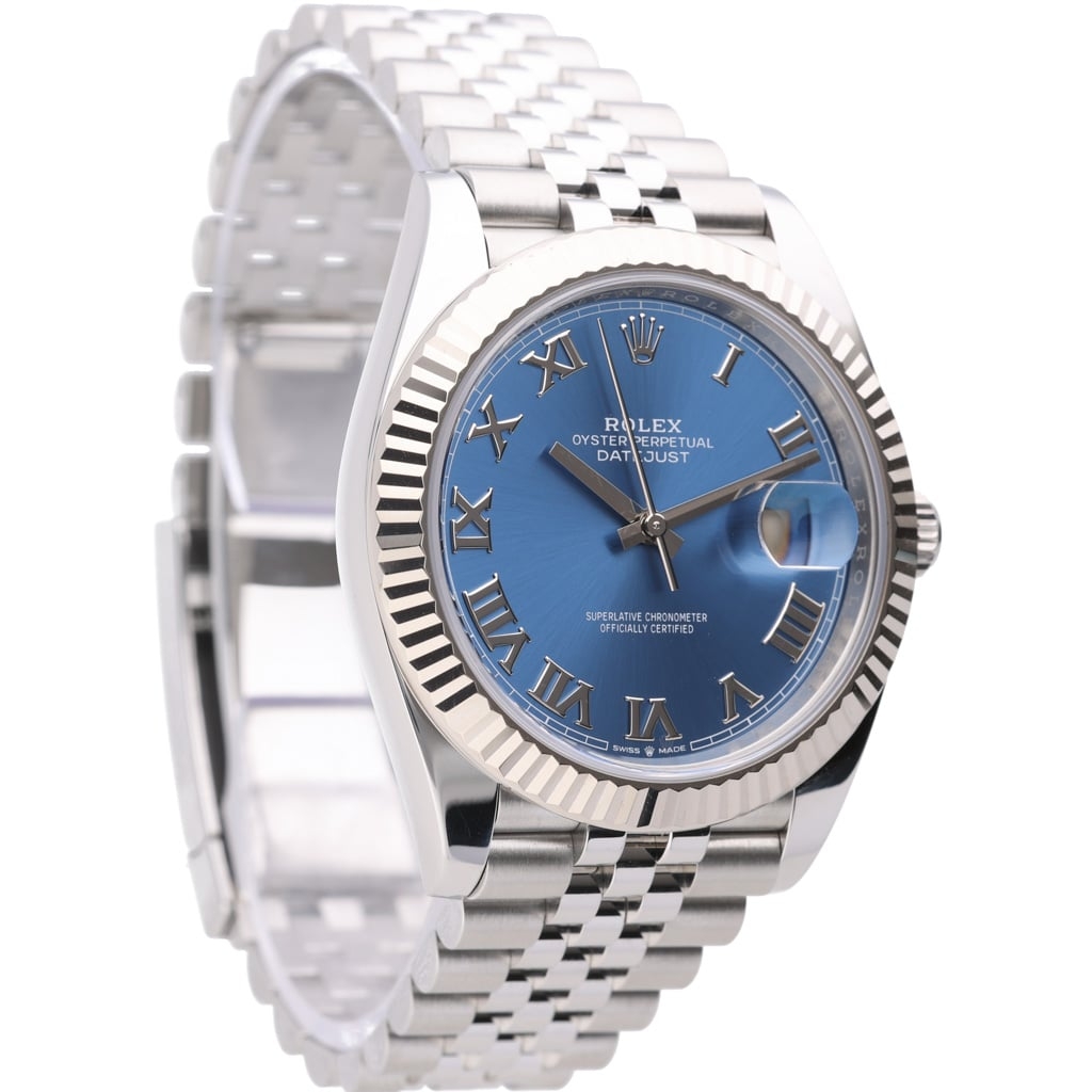 This Rolex Datejust 41 ref. 126300 presents a striking modern take on one of Rolex’s most recognisable designs. Crafted from robust stainless steel, the 41mm case offers strong wrist presence while remaining refined and wearable for daily use. The blue Roman dial shown here is particularly eye-catching, with a sunburst finish that shifts beautifully in changing light, complemented by applied Roman numerals and the classic Cyclops date window at 3 o’clock. Paired with the Jubilee bracelet, the watch achieves a perfect balance of contemporary elegance and classic Rolex style.