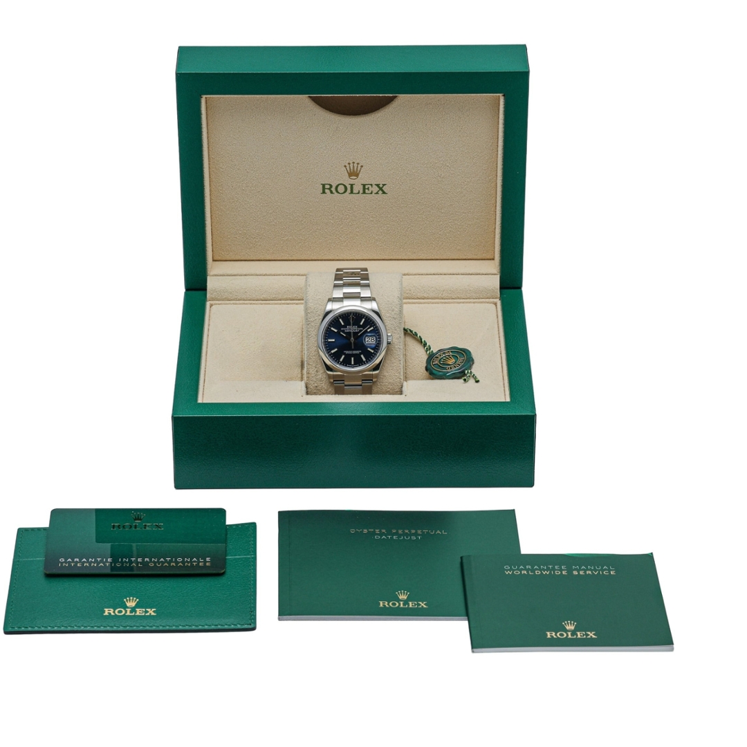 A Rolex Datejust 126200 is presented in stainless steel with a striking blue sunburst dial, offering a clean and contemporary take on this classic model. The 36mm Oyster case provides a balanced and wearable profile, while luminous baton hour markers and the Cyclops-enhanced date display ensure excellent everyday legibility. The smooth bezel and Oyster bracelet contribute to its refined and understated aesthetic.