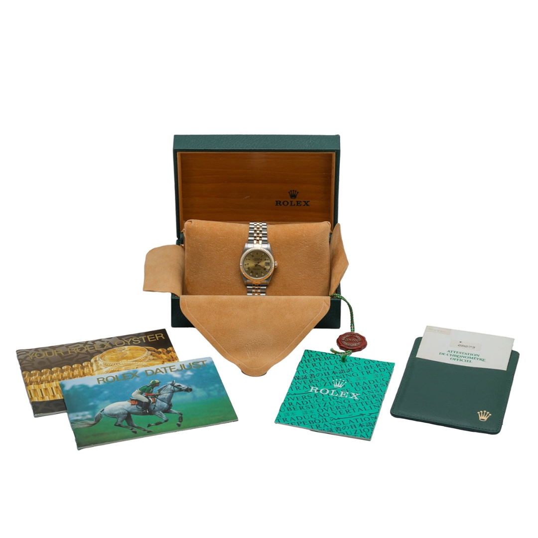 A bi-metal Rolex Datejust 31 offering timeless refinement, this reference 68273 pairs stainless steel with 18ct yellow gold for a classic two-tone finish. The champagne dial complements the fluted yellow-gold bezel perfectly, creating that unmistakable Datejust warmth collectors love. The clean baton hour markers and matching gold hands give this 1995 example an elegant, understated presence, while the 31mm case size makes it a versatile choice for both daily wear and more formal occasions.