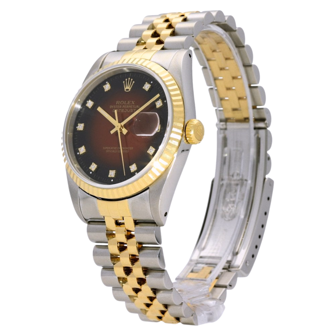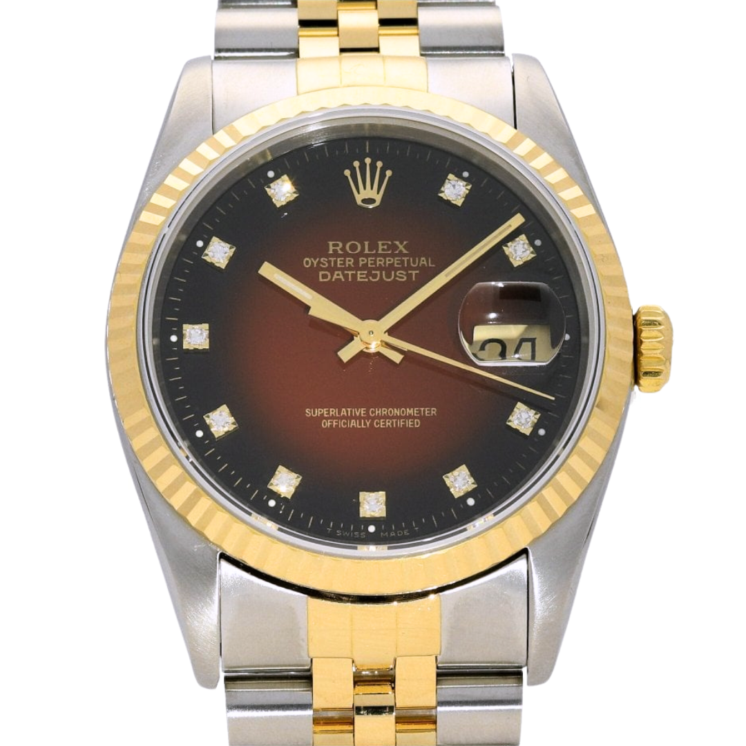 The 16233 represents one of the most enduring Datejust configurations, combining everyday versatility with unmistakable Rolex presence. The warm tones of the bi-metal case and bracelet contrast beautifully with the rich red dial. At the same time, the diamond dot markers add a subtle layer of refinement without overpowering the design.