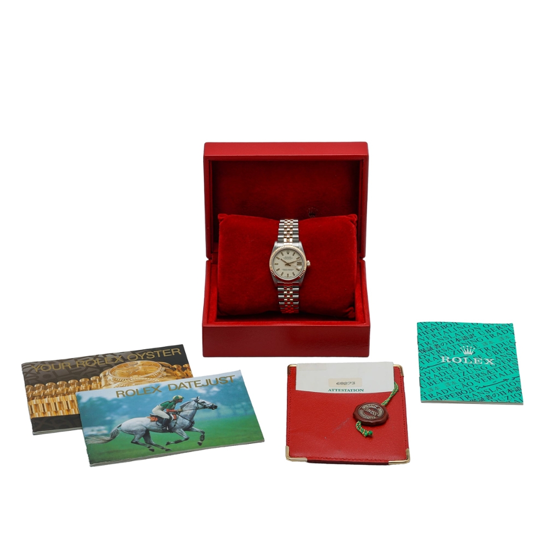 A Rolex Datejust 68273, presented in stainless steel and 18ct yellow gold with an 18ct yellow gold fluted bezel and a classic cream dial with baton hour markers. The 31mm case offers elegant proportions, while the warm tones of yellow gold contrast beautifully with the soft dial colour, creating a timeless, understated aesthetic synonymous with the Datejust line.