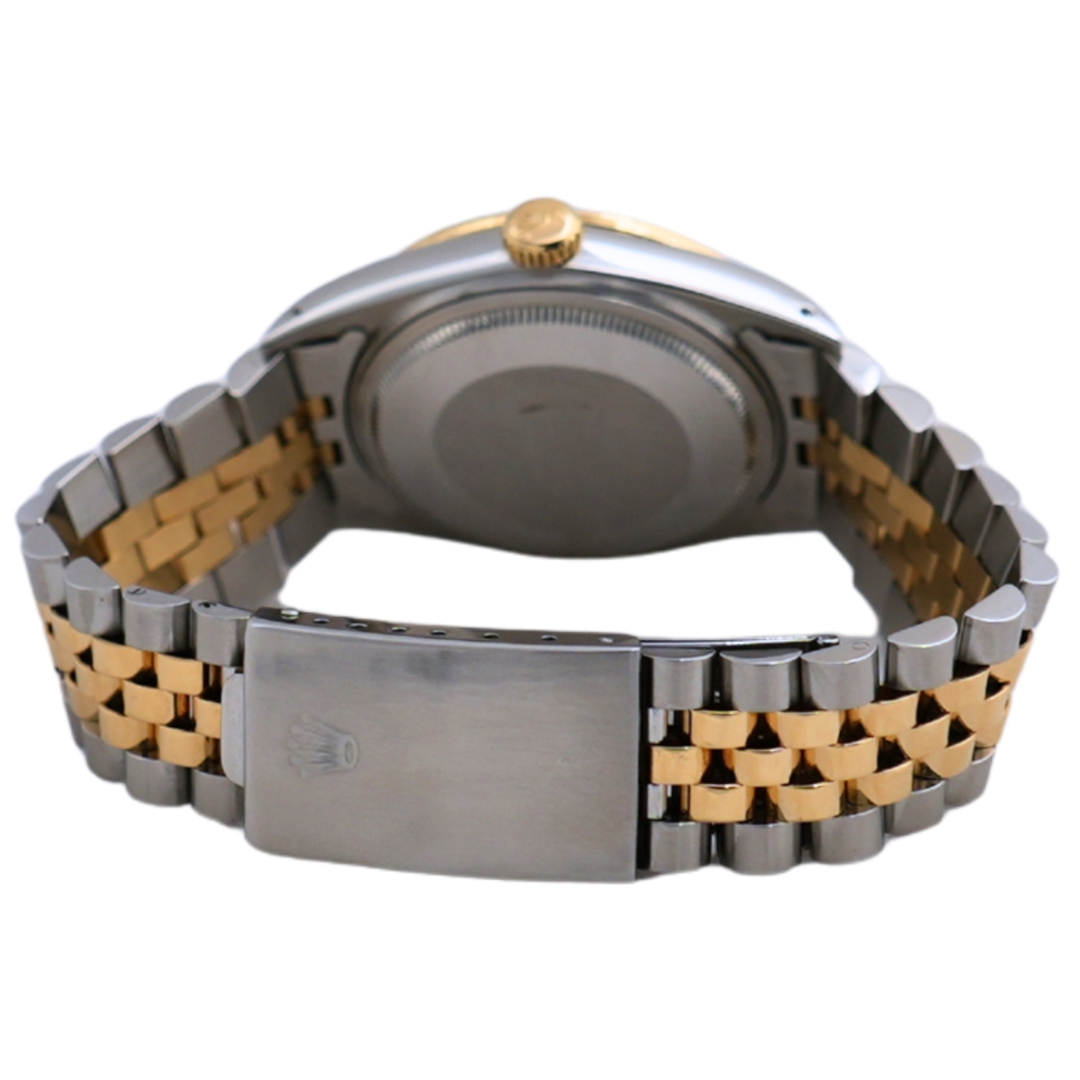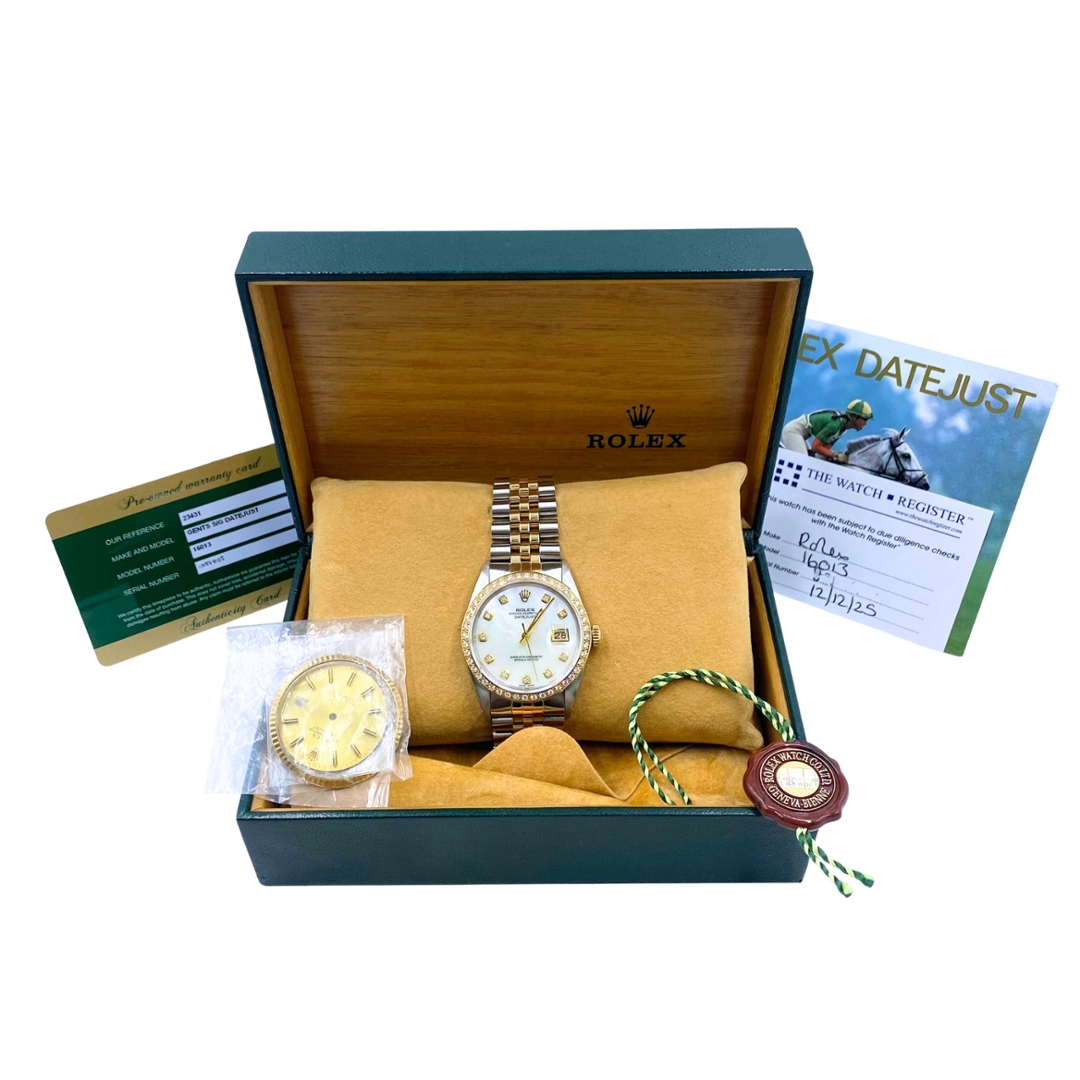 A Rolex Datejust 36, reference 16013, presents a classic bi-metal configuration combining stainless steel with 18ct yellow gold. Produced in 1984, it features a 36mm Oyster case paired with a yellow gold Jubilee bracelet, delivering the timeless proportions that define vintage Datejust models. The watch features a white mother-of-pearl dial with soft iridescence that shifts subtly under different light, complemented by diamond hour markers for added visual impact.