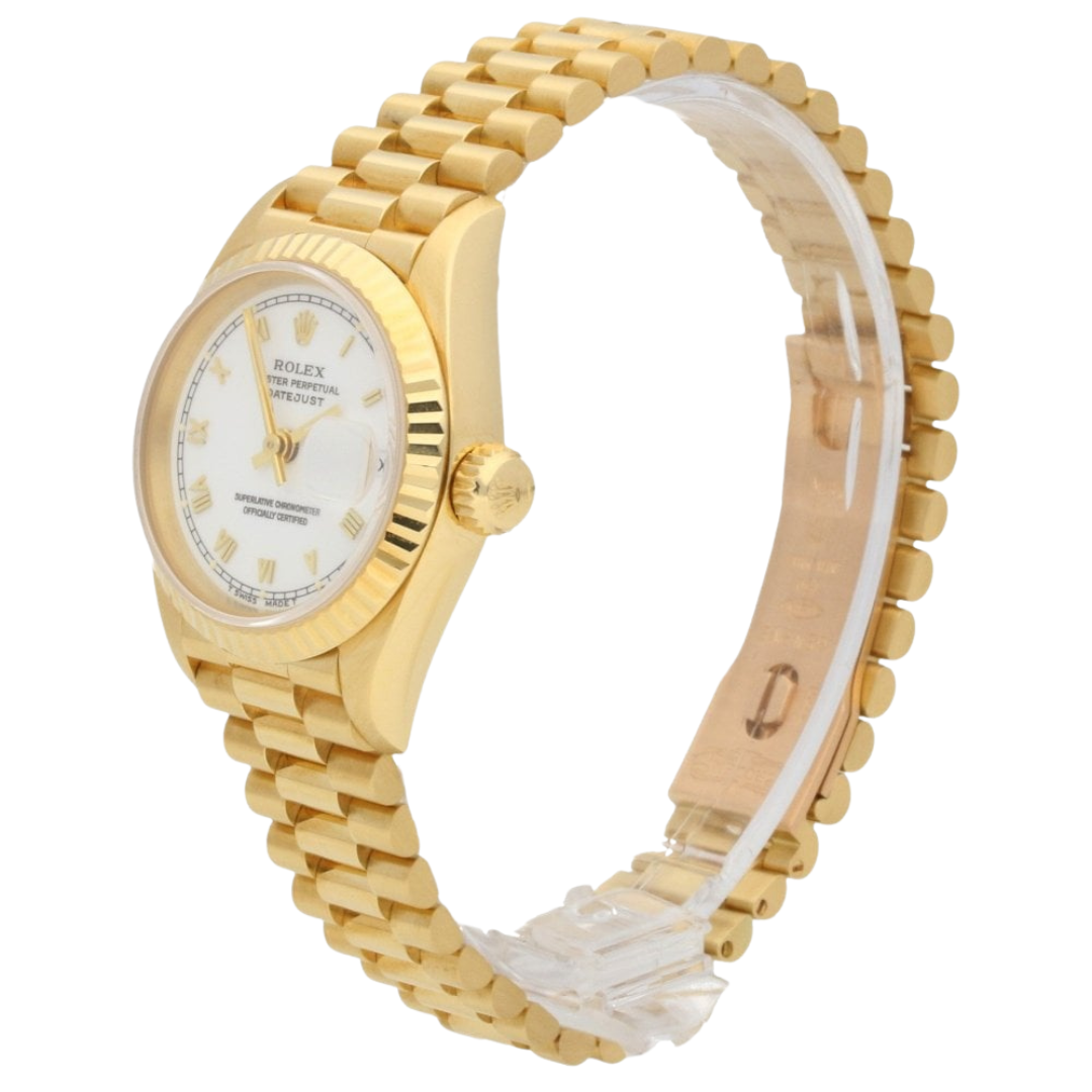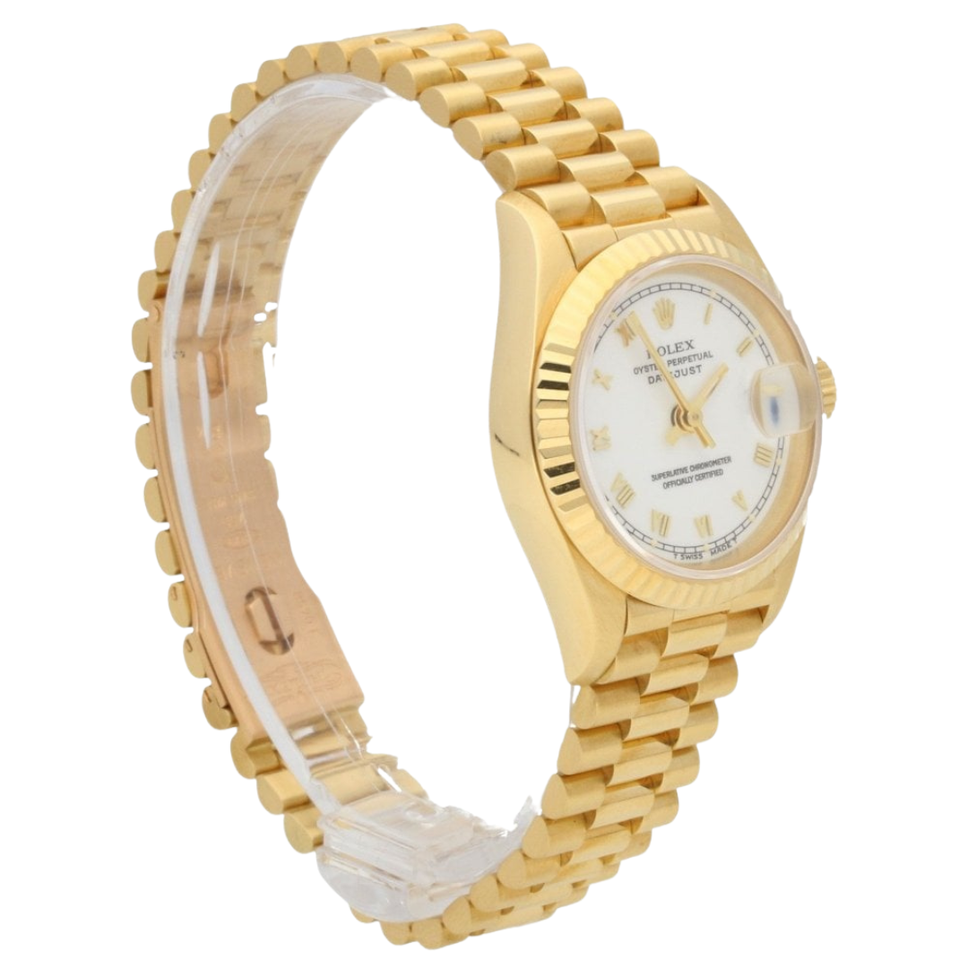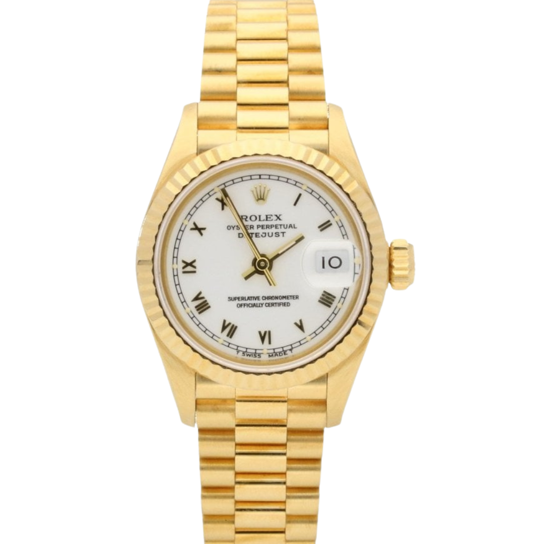 This Rolex Datejust reference 69178 presents the model in its most elevated form, crafted entirely from 18ct yellow gold. The 26mm Oyster case is paired with a fluted yellow gold bezel, framing a crisp white Roman dial that delivers timeless contrast and unmistakable Rolex character. Gold Roman numerals and matching hands maintain a refined, balanced aesthetic, while the Cyclops lens over the date remains a signature hallmark of the Datejust line.