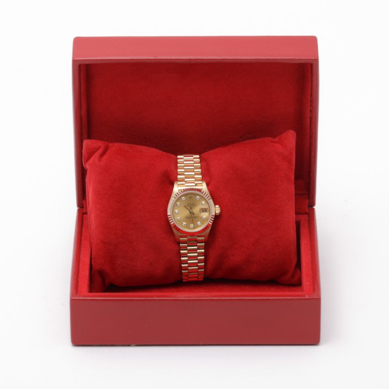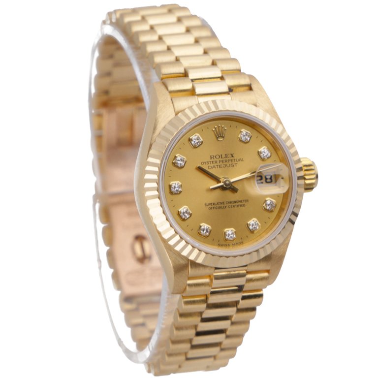 A Rolex Datejust, reference 69178, is a classic full-gold ladies’ configuration that embodies Rolex’s late-1990s design language. Produced in 1998, the 26mm case is crafted entirely from 18ct yellow gold and fitted with a fluted yellow gold bezel. The champagne dial features original Rolex diamond-set hour markers and pairs with the President bracelet, delivering a cohesive, highly recognisable aesthetic.