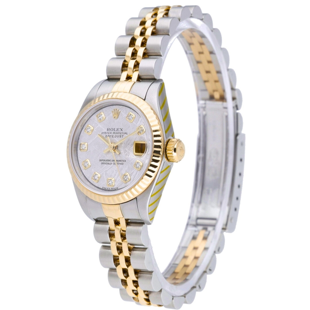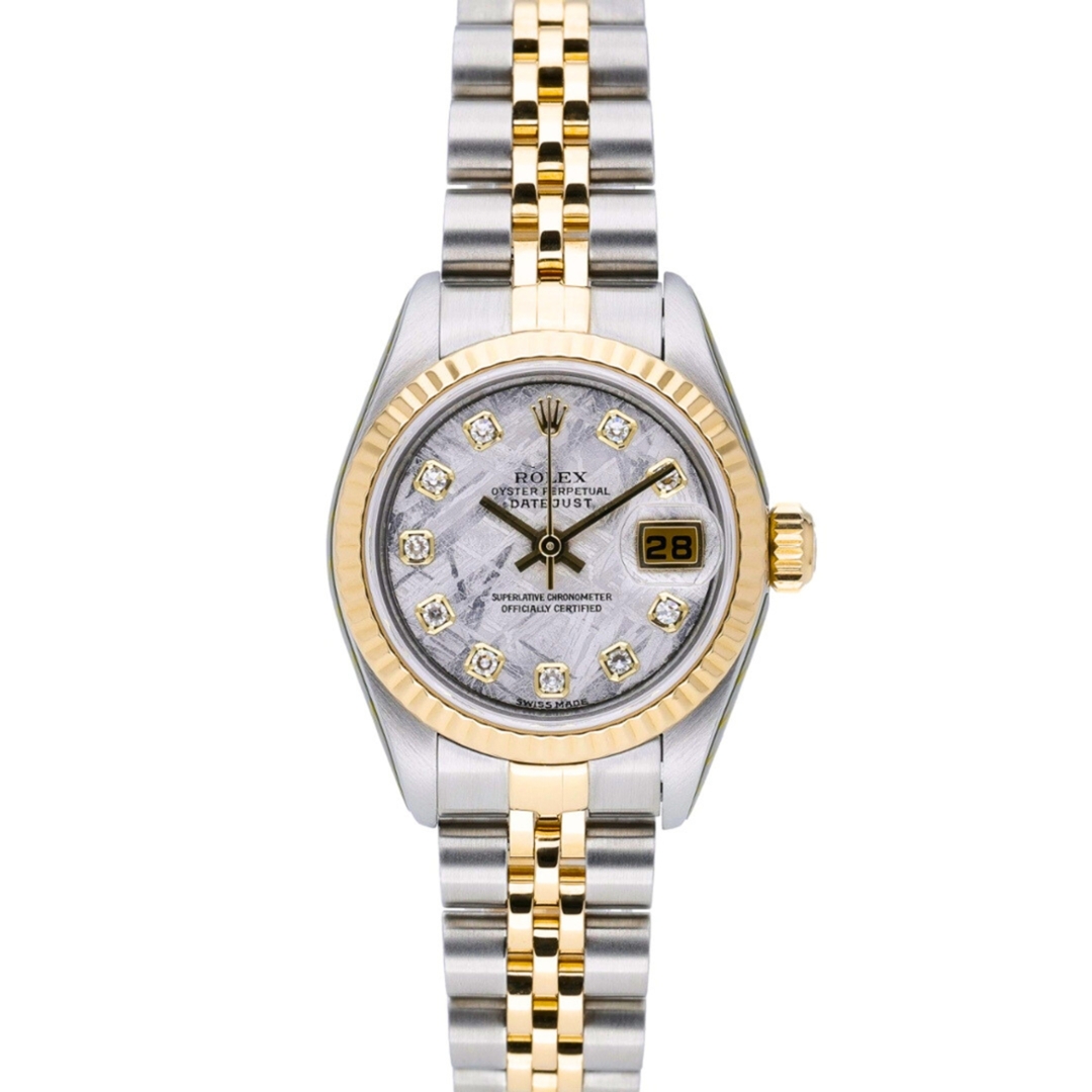 A Bi-Metal Rolex Datejust 26 Watch, crafted from stainless steel and 18ct yellow gold with a fluted bezel, presented on the iconic jubilee bracelet. This rare reference 79173 features a remarkable factory meteorite dial, beautifully complemented by original Rolex diamond hour markers. The natural patterning of the meteorite makes every example unique, ensuring no two dials are ever the same.