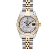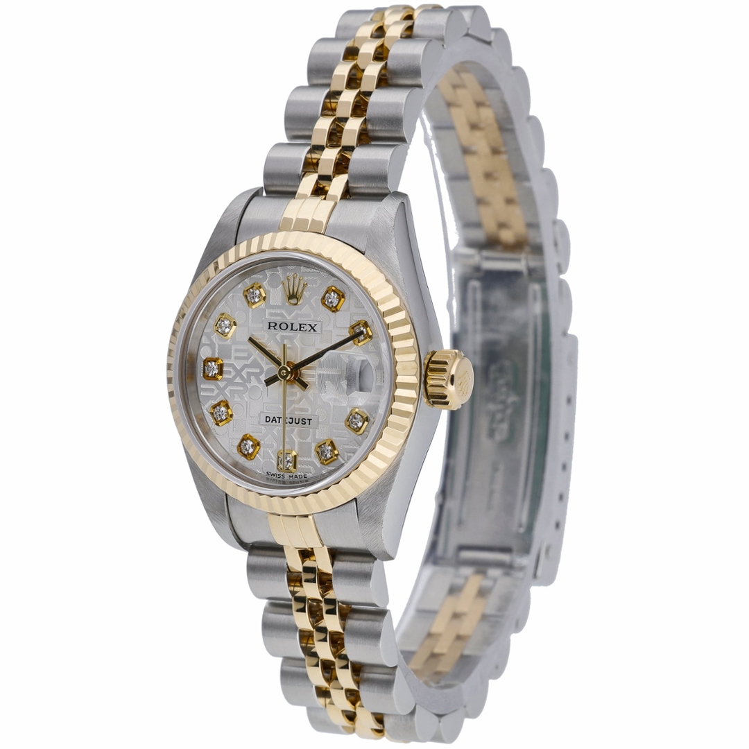 This bi-metal Rolex Datejust 26 reference 79173 combines a stainless steel case with 18ct yellow gold, paired with the iconic Rolesor Jubilee bracelet. The silver Jubilee dial features the distinctive repeating Rolex motif and is enhanced by original factory-set Rolex diamond hour numerals, adding subtle brilliance while retaining classic elegance. The fluted yellow gold bezel frames the compact 26mm case beautifully, making it a timeless and refined piece.