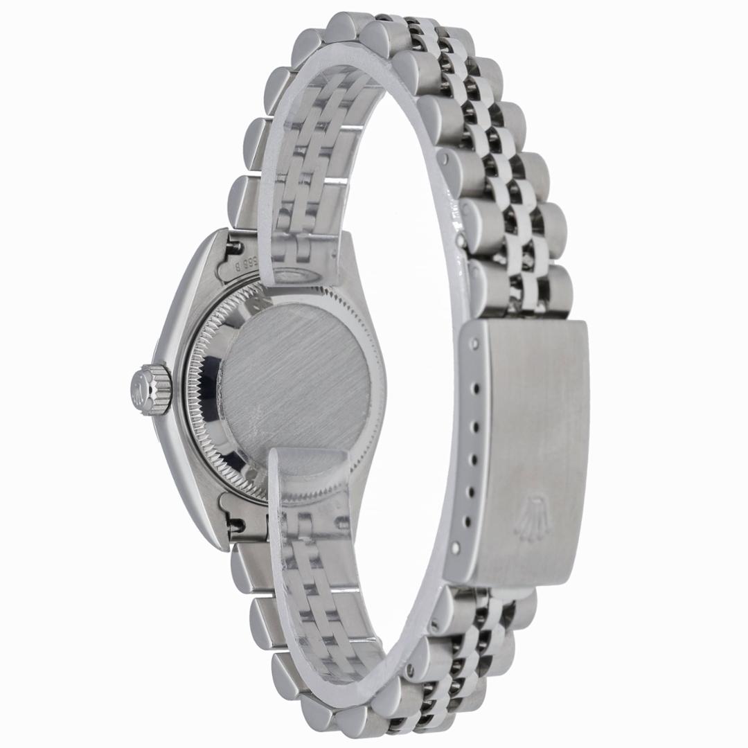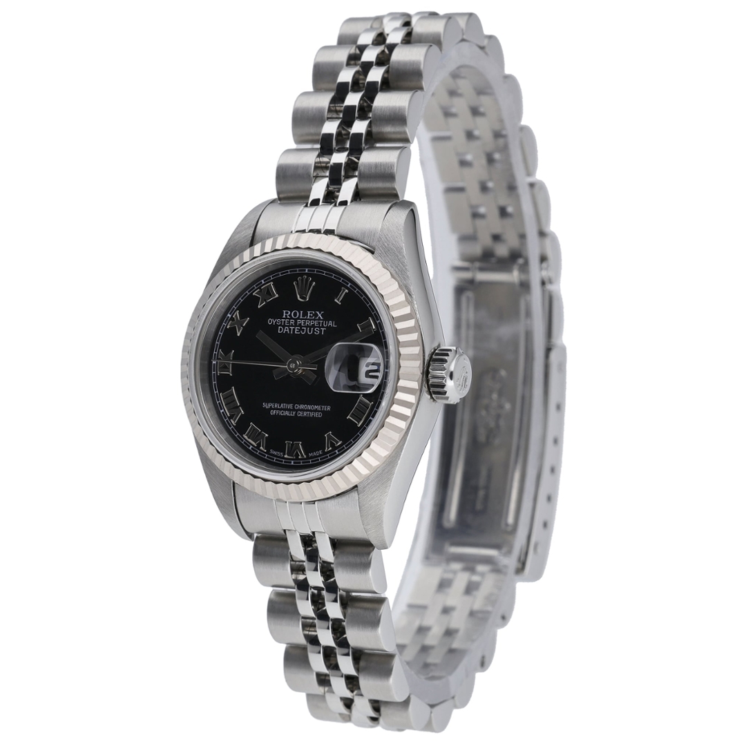 This Rolex Datejust reference 79174 features a classic, understated configuration, crafted in stainless steel with an 18ct white gold fluted bezel. The black dial features applied Roman numerals, offering strong contrast and excellent legibility, while the 26mm case delivers a timeless, well-balanced profile suited to everyday wear.