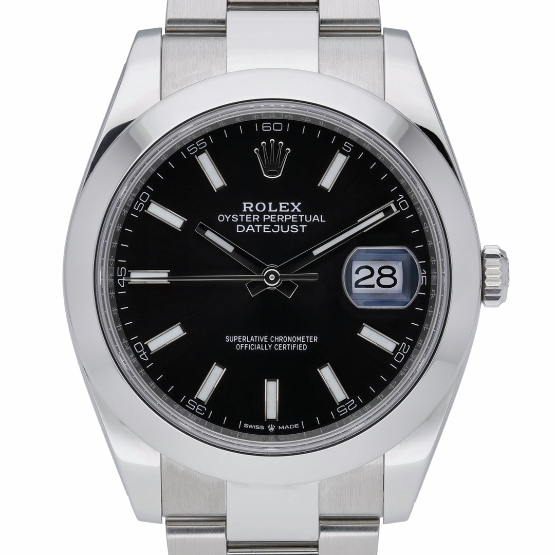 A Rolex Datejust 41 reference 126300 is presented in stainless steel with a clean black dial, offering a contemporary take on one of Rolex's most enduring designs. The smooth bezel and Oyster bracelet give the watch a purposeful, understated profile, while the 41mm case delivers modern proportions that sit confidently on the wrist.
