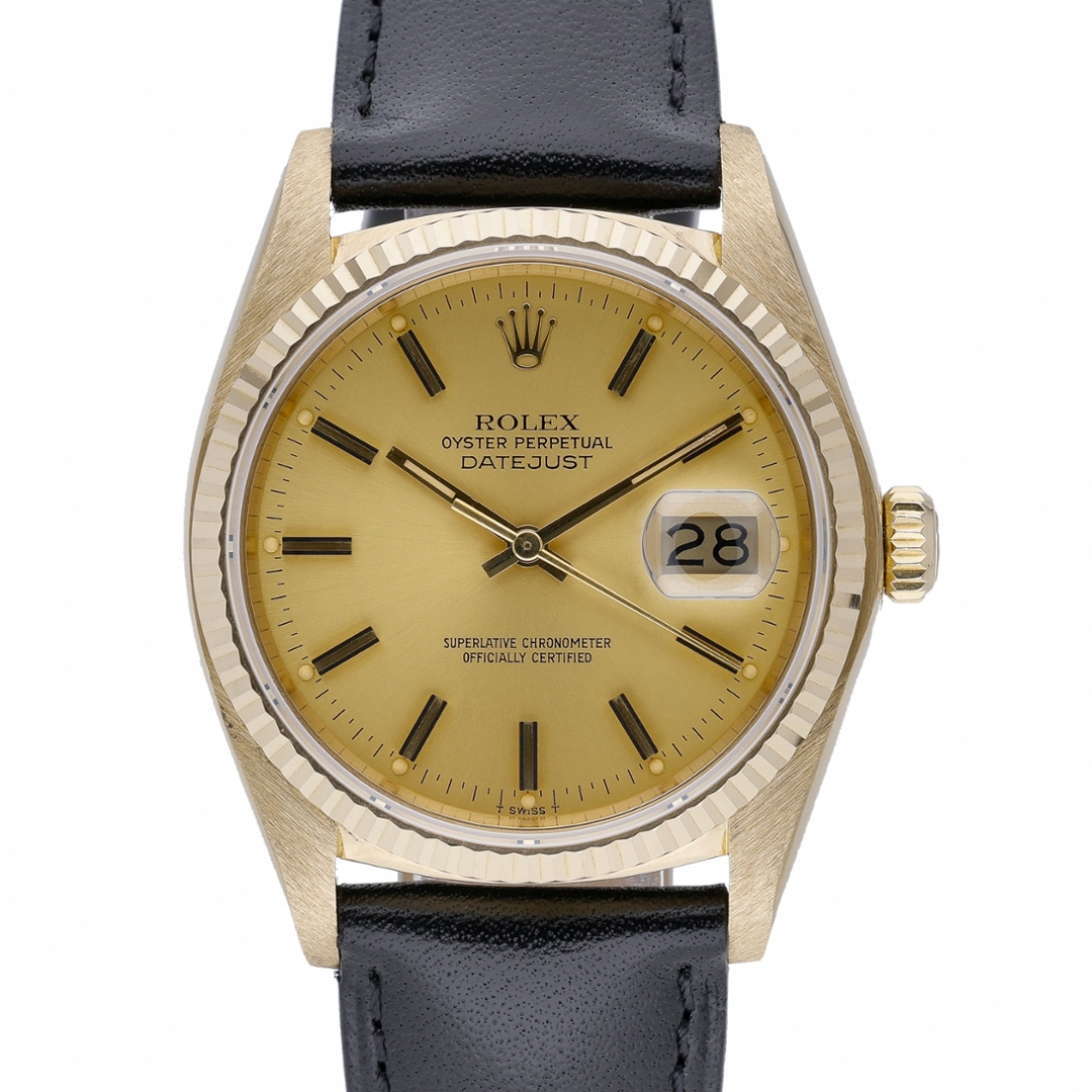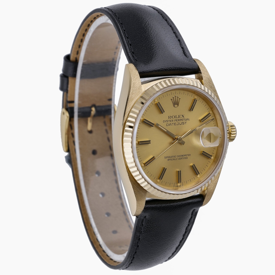 This Rolex Datejust reference 16018 features the classic 36mm Oyster case crafted entirely from 18ct yellow gold, paired with a matching yellow gold fluted bezel. The champagne dial is fitted with applied baton hour markers and gold hands, framed by an acrylic crystal with cyclops date magnification. Presented on a black leather strap, this configuration offers a more understated take on a traditionally bracelet-fitted reference.