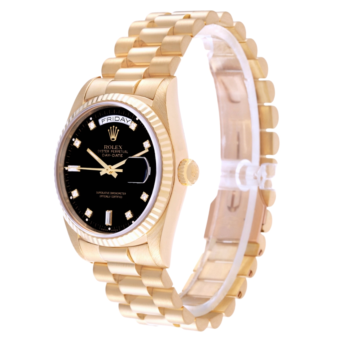 A Rolex Day-Date Watch, Full 18ct Yellow Gold with a Yellow Gold Fluted Bezel and a Black Dial with Original Rolex Diamond Numerals.