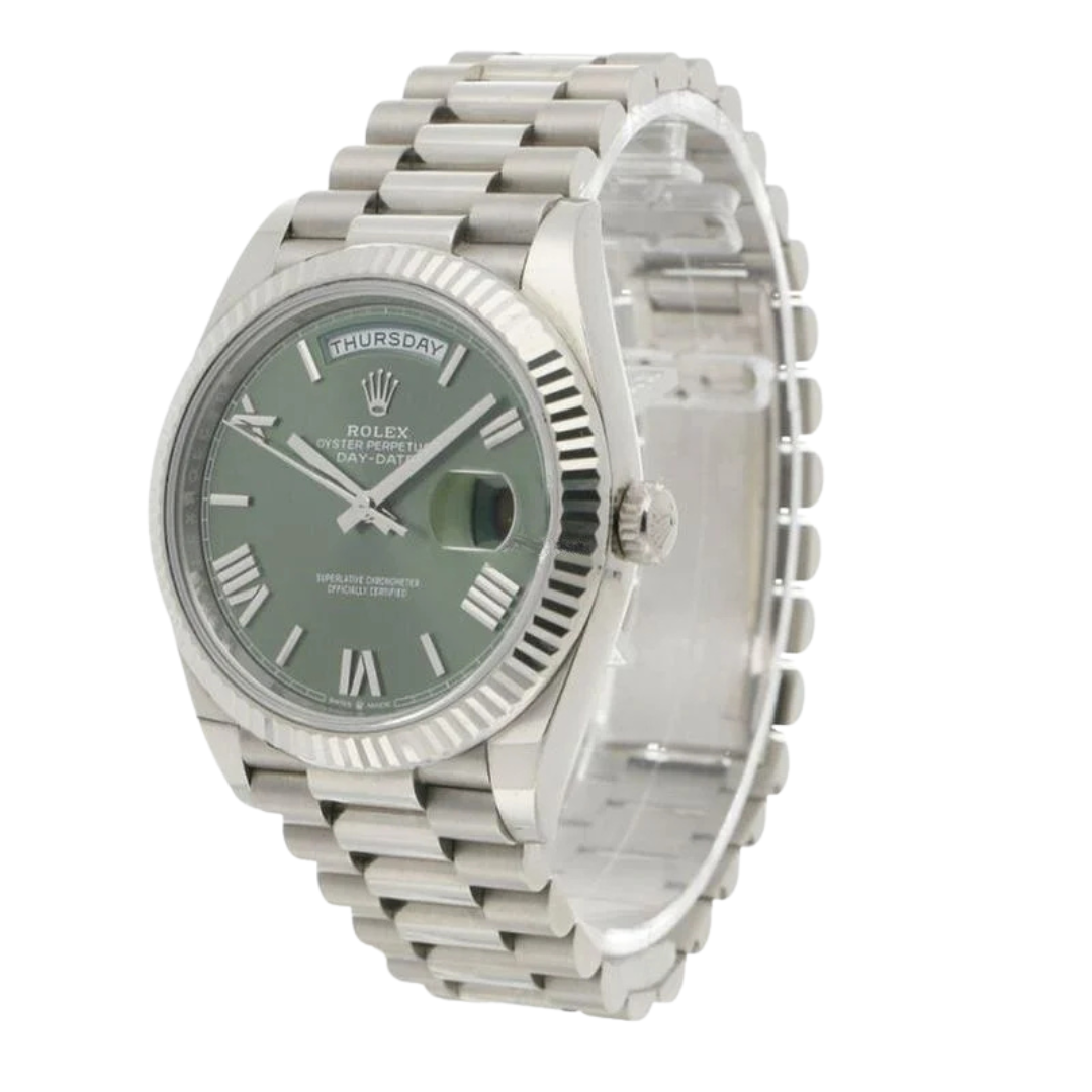 A Rolex Day-Date watch crafted in full 18ct white gold, reference 228239, featuring the iconic white gold fluted bezel and a highly desirable olive green dial. Produced in 2021, this 40mm Day-Date pairs unmistakable presence with refined proportions, sitting confidently on the wrist via the solid President bracelet.