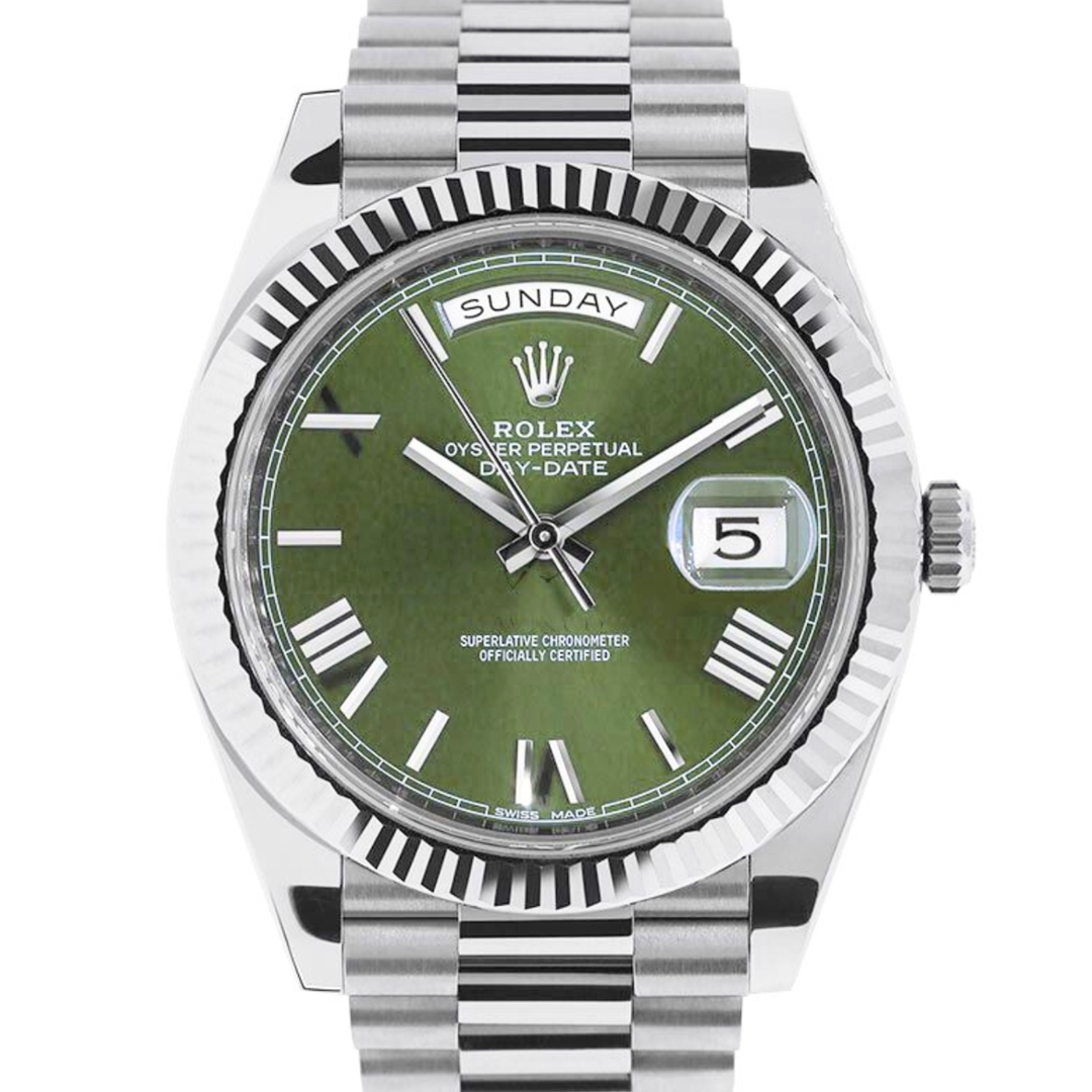 A Rolex Day-Date watch crafted in full 18ct white gold, reference 228239, featuring the iconic white gold fluted bezel and a highly desirable olive green dial. Produced in 2021, this 40mm Day-Date pairs unmistakable presence with refined proportions, sitting confidently on the wrist via the solid President bracelet.