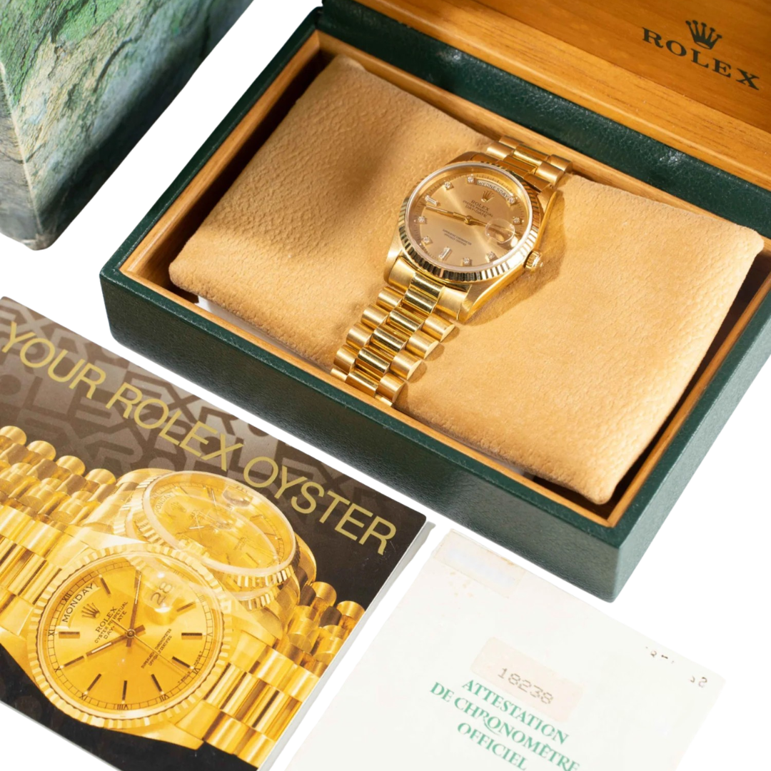 A Rolex Day-Date Watch, Full 18ct Yellow Gold and a Champagne Dial with Original Rolex Diamond Numerals