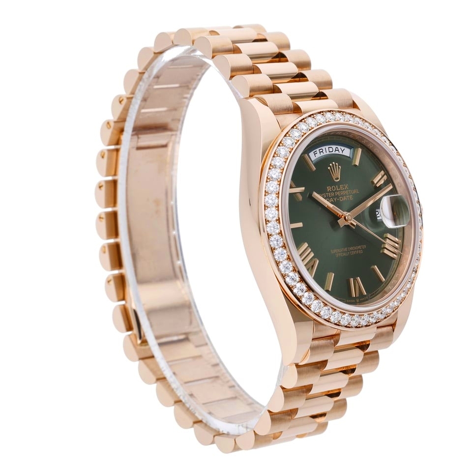A Rolex Day-Date Watch, Full 18ct Rose Gold with a Rolex Factory Set Diamond Bezel and an Olive Green Dial on a Presidential Bracelet.