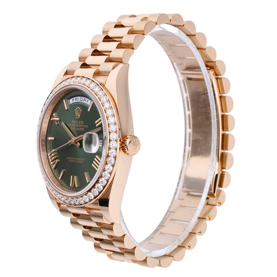 A Rolex Day-Date Watch, model 228345RBR, presented in immaculate condition. This 2024 reference is crafted entirely from 18ct rose gold, featuring a factory-set diamond bezel and the highly sought-after olive green dial with applied rose gold hour markers. Fitted to the iconic President bracelet and powered by the Rolex Calibre 3255 automatic movement, this watch combines technical excellence with unmistakable presence. It is offered complete with its original Rolex paperwork, presentation box, and the balance of the Rolex manufacturer's warranty until 2029.