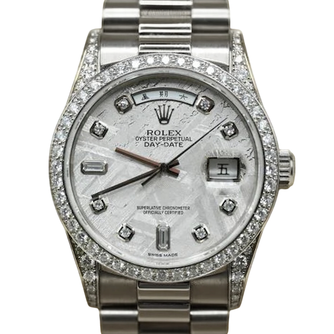 A Rolex Day-Date 18389 in full 18ct white gold, presented with a striking meteorite dial set with diamond numerals and housed in the classic 36mm Oyster case. The dial displays the distinctive natural Widmanstätten pattern unique to genuine meteorite, paired with diamond-set hour markers and the iconic day and date apertures. Powering the watch is Rolex’s automatic Calibre 3155, offering double quickset functionality and renowned long-term reliability.