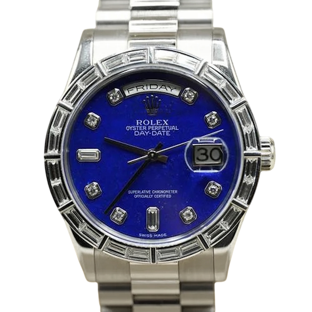 A Rolex Day-Date 118366 in full platinum, distinguished by its factory baguette diamond bezel and striking lapis blue dial set with diamond numerals. The 36mm Oyster case carries the unmistakable weight and presence unique to platinum. At the same time, the rich blue stone dial offers natural depth and individuality, ensuring no two examples are ever identical. The day aperture at 12 and date at 3 preserve the classic Day-Date symmetry that has defined the model since its inception.