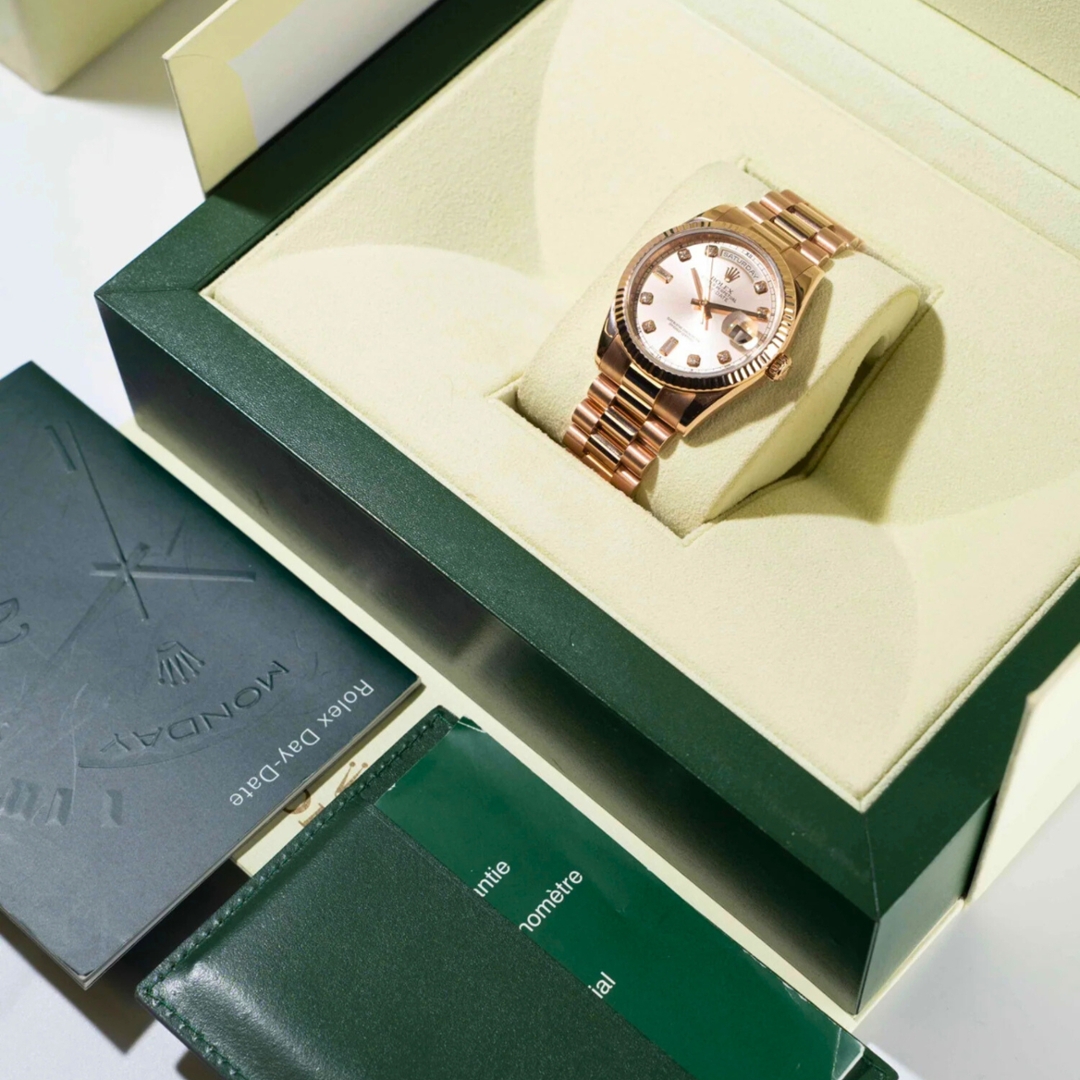 A Rolex Day-Date reference 118235F in full 18ct Everose gold, fitted with a factory diamond dial and presented on the iconic Presidential bracelet. The 36mm case is complemented by a fluted bezel in matching Everose gold, delivering the unmistakable presence that has defined the Day-Date line for decades. The sunburst dial is enhanced by diamond hour markers, including a baguette-cut diamond at 6 o’clock, adding refinement without overpowering the classic design.