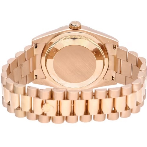 Powered by the Rolex Calibre 3155 automatic movement, this model features both day and date complications with instantaneous change. The solid gold Presidential bracelet provides both comfort and weight, reinforcing the Day-Date’s position as Rolex’s flagship precious metal watch.