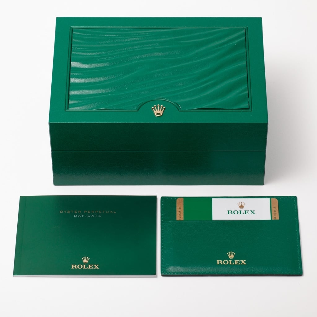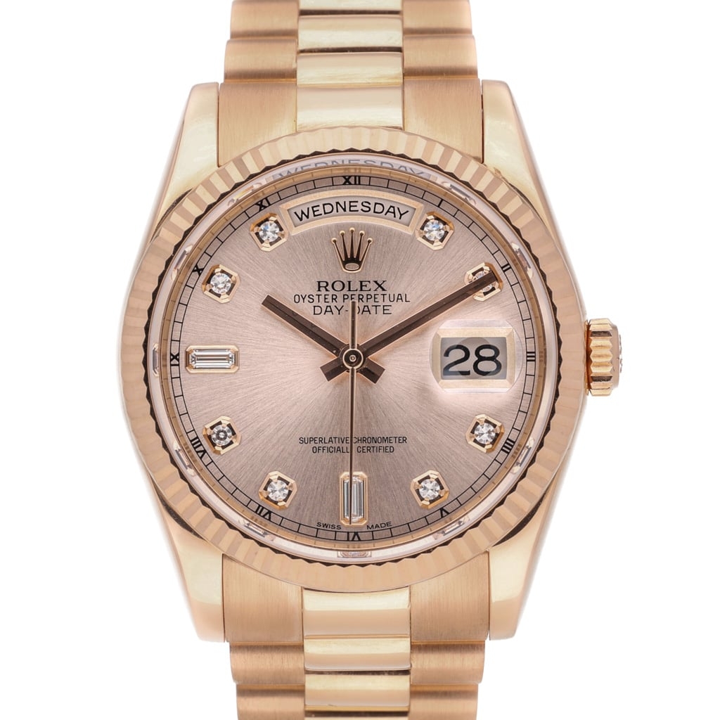 The classic 36mm Oyster case is complemented by the signature fluted bezel, a hallmark of the Day-Date that reflects light beautifully while enhancing the watch’s unmistakable presence. The warm pink dial is elevated by original Rolex diamond hour markers, including baguette-set diamonds at six and nine o’clock, adding an additional level of refinement and exclusivity. Powering the watch is the Rolex Calibre 3155 automatic movement, renowned for its reliability and precision.