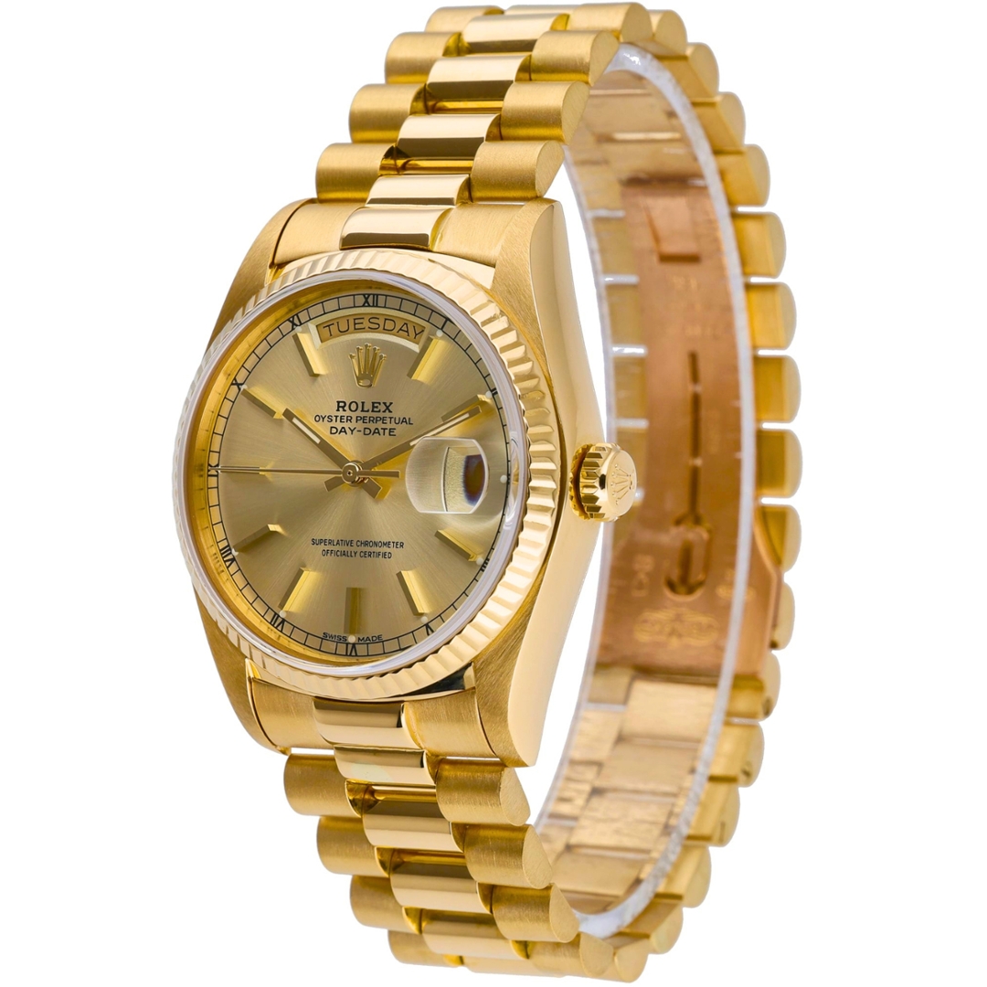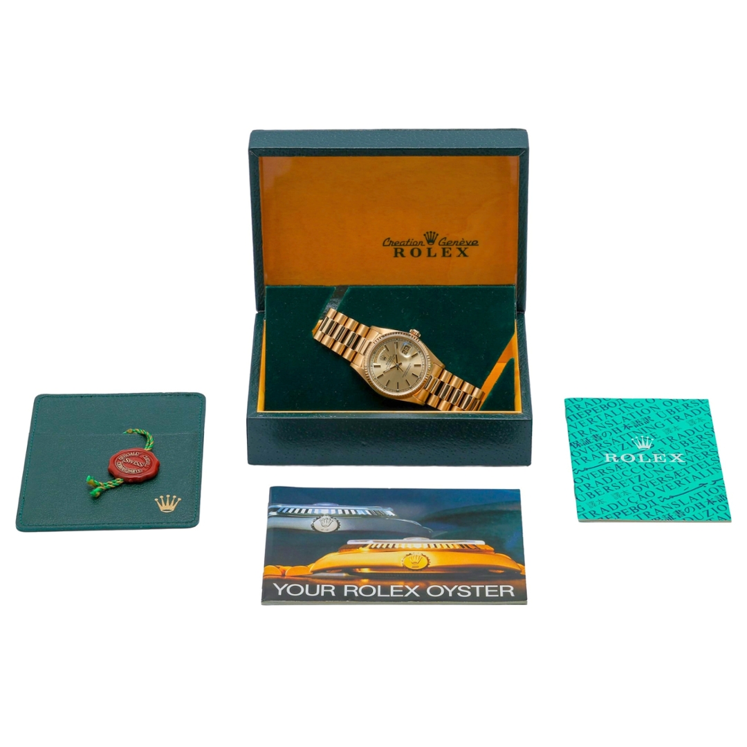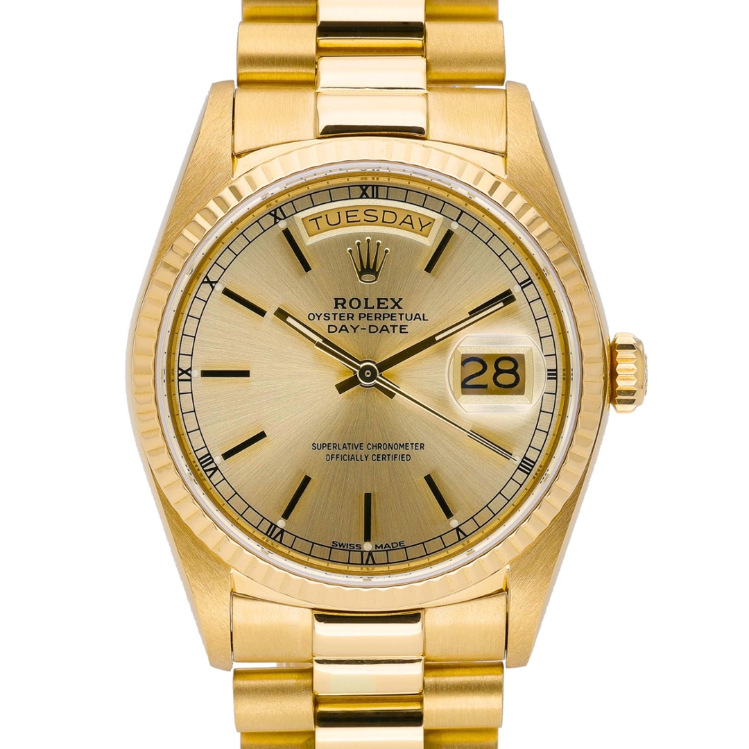 Adorned with a champagne dial, the Day-Date 18038 radiates warmth and sophistication, beautifully complementing its golden exterior. The dial features the iconic day-date display at the 12 o'clock and 3 o'clock positions, enhancing both functionality and aesthetic appeal.