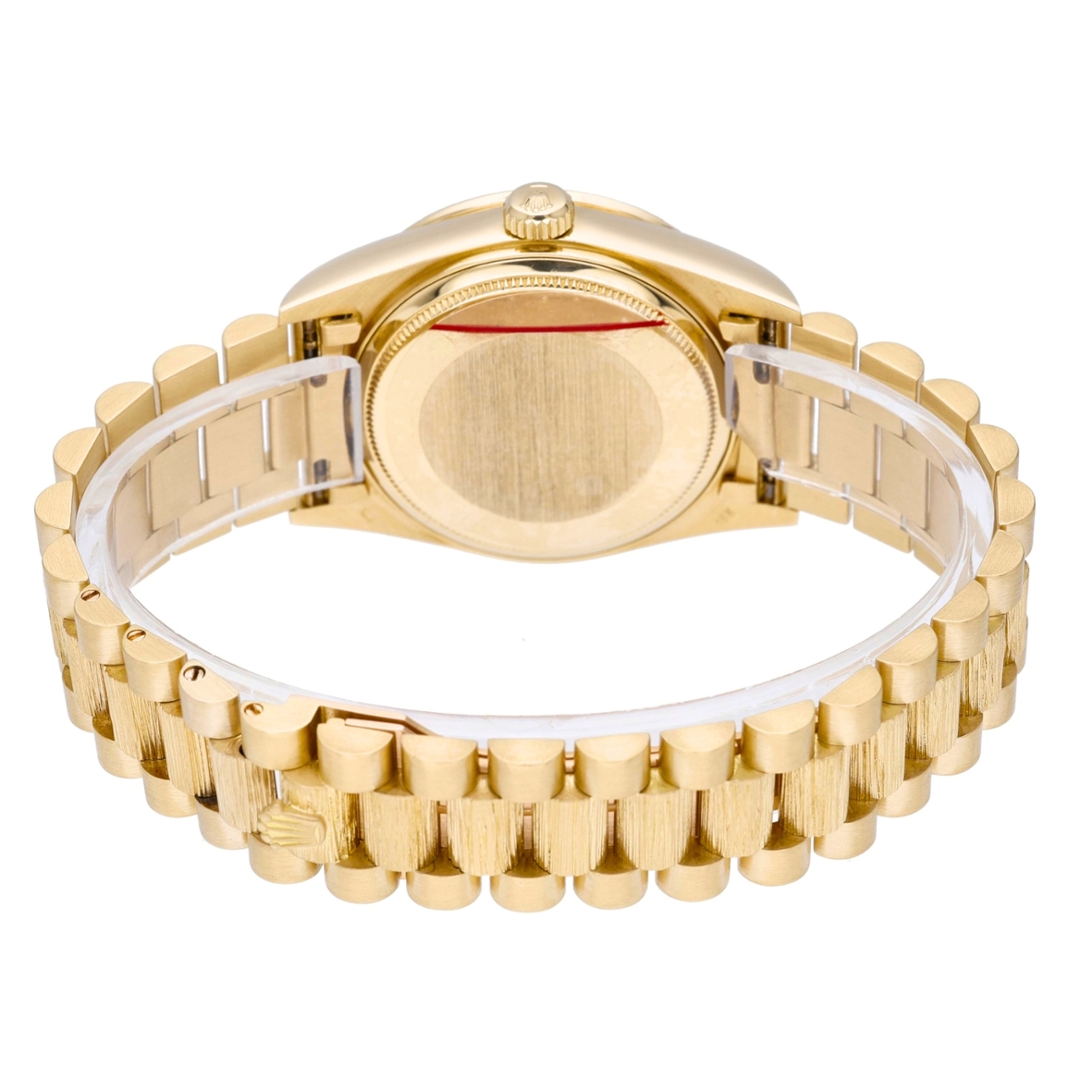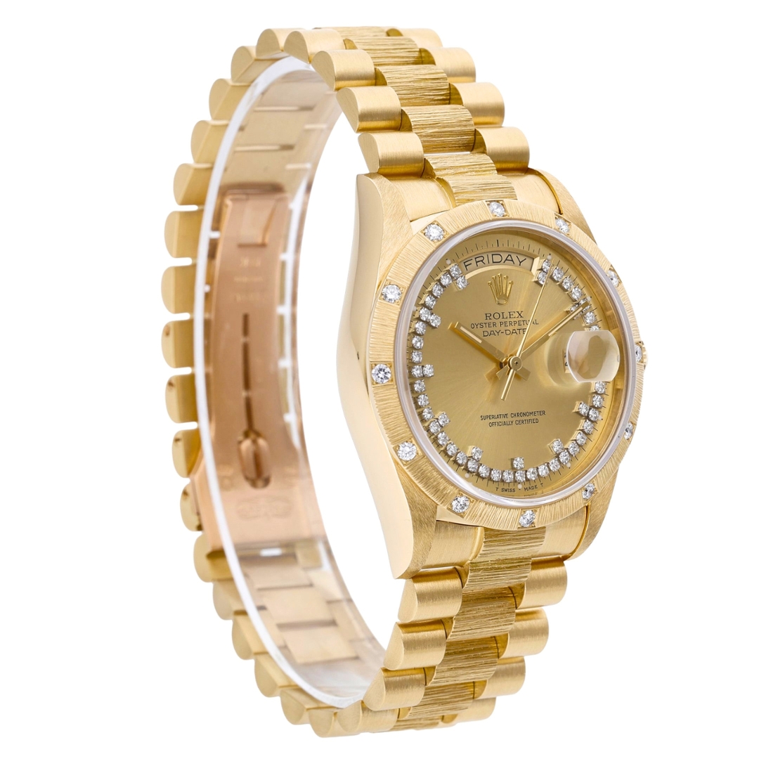 A Rolex Day-Date, model 18108, presented in full 18ct yellow gold, showcasing a bold and highly individual configuration. The 36mm case features the distinctive bark-textured finish across the bezel and matching Presidential bracelet, enhancing its vintage character and tactile appeal. This example is further elevated with an afterset diamond bezel, complementing the champagne dial, which has been customised with diamond hour markers and scattered diamonds throughout, creating a striking and unmistakable aesthetic. The classic day aperture at 12 o’clock and date display at 3 o’clock retain the iconic Day-Date functionality.