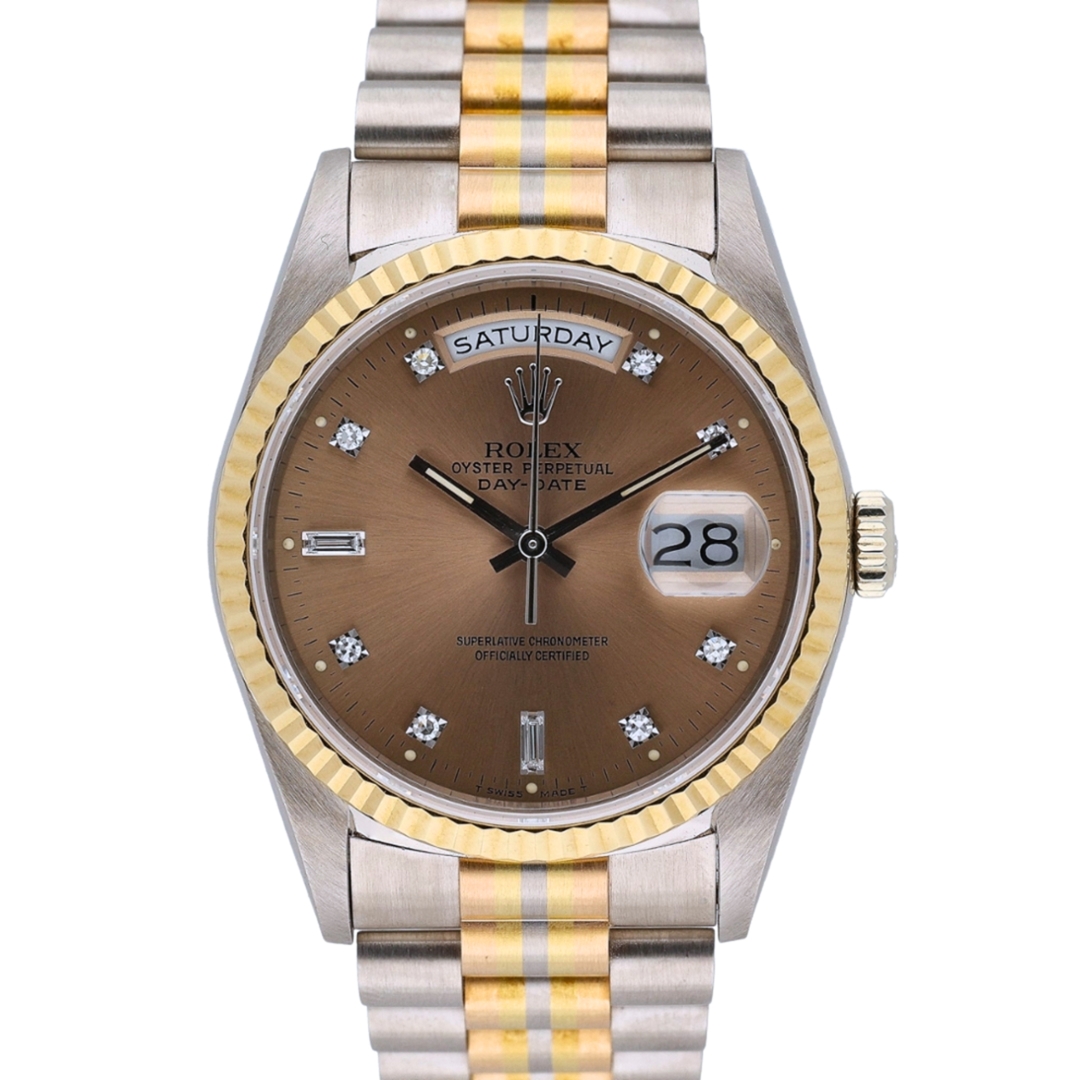 A Rolex Day-Date Watch, 18ct White Gold with an 18ct Yellow Gold Fluted Bezel on a Tridor Bracelet (18ct Rose, Yellow, & White Gold) on a Brown Champagne Dial with Original Rolex Diamond Numerals