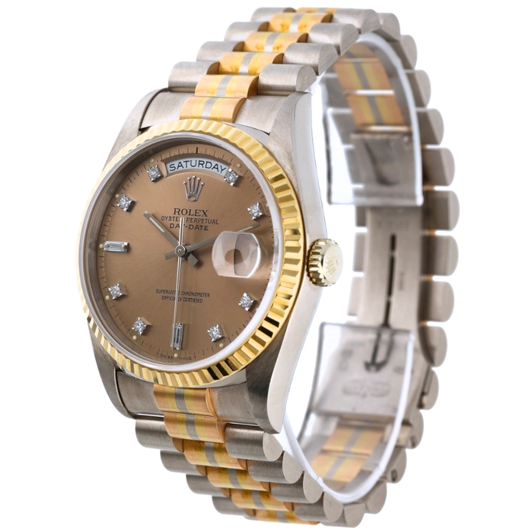 Rolex Day-Date reference 18239 is crafted in 18ct white gold and paired with the highly distinctive Tridor President bracelet, combining 18ct white, yellow, and rose gold. The fluted 18ct yellow gold bezel frames a rich champagne brown dial, set with original factory Rolex diamond hour markers and the iconic day and date apertures.