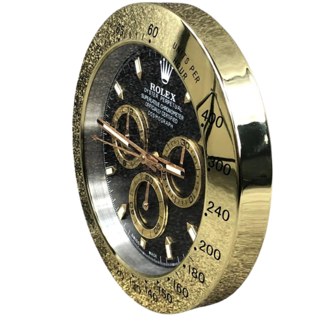 A stainless steel replica Rolex Daytona wall clock, presented with a striking black dial and gold-tone bezel that delivers a bold and luxurious interpretation of this iconic chronograph design. The contrasting gold accents across the hands, hour markers, and sub-dial surrounds create a rich, eye-catching aesthetic, while the tachymeter scale enhances its unmistakable motorsport-inspired identity.