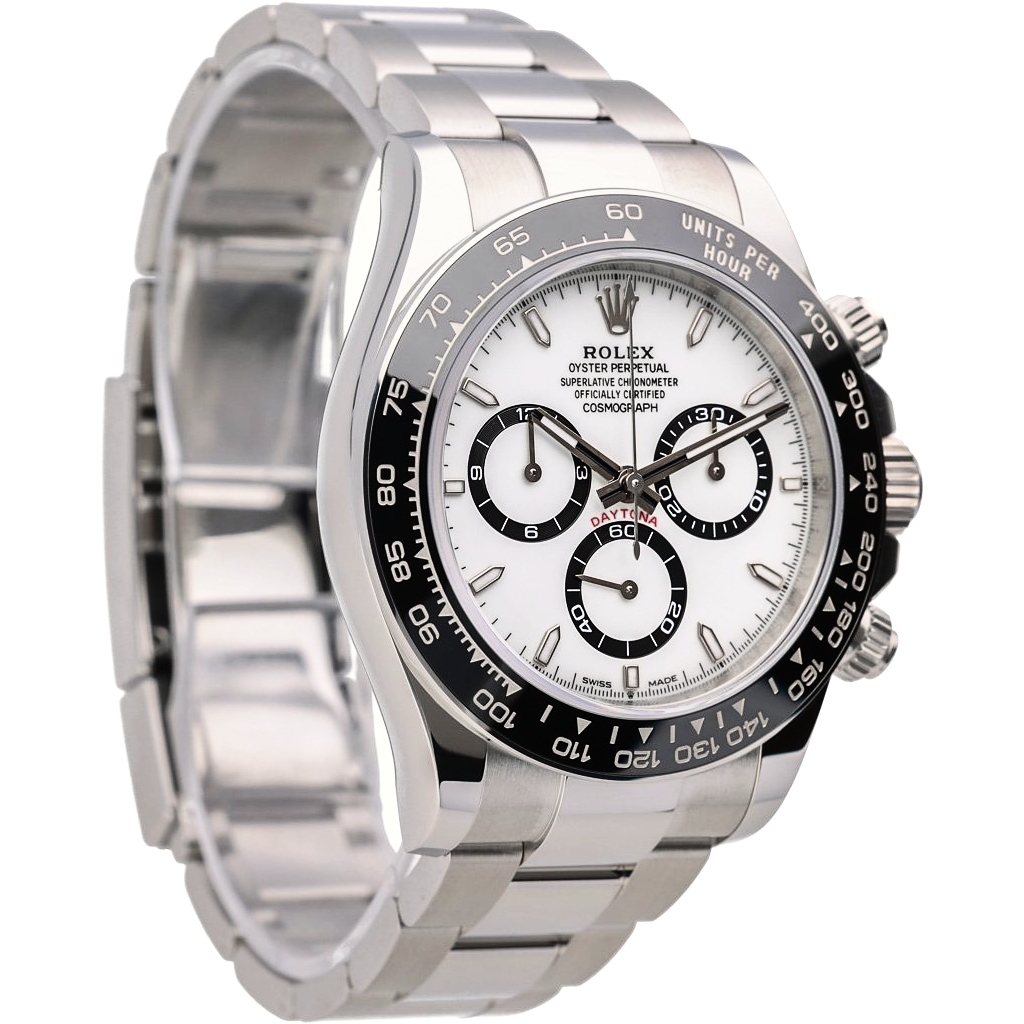 A Rolex Daytona 126500LN, a 2023 model, embodies the pinnacle of luxury and precision in the watchmaking industry. This exquisite timepiece features a robust 40mm stainless steel case, strikingly complemented by a sleek black bezel. The white dial offers a clean, sophisticated contrast, enhancing its legibility and timeless appeal.