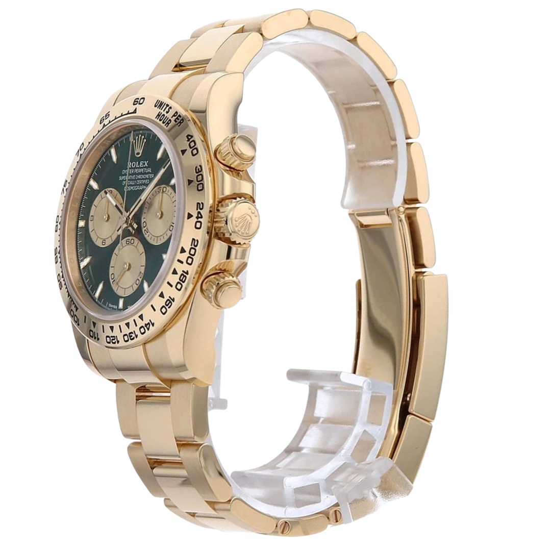 A Rolex Cosmograph Daytona 126508 in full 18ct yellow gold, featuring a striking green dial, is one of the most coveted modern references, blending prestige, exclusivity, and investment appeal. Nicknamed the “John Mayer Daytona” after the musician famously highlighted its beauty, this watch has become an icon in its own right, commanding strong attention from collectors worldwide. The vibrant green dial contrasts magnificently with the warm tones of the yellow gold case and bracelet, while the gold sub-dials provide perfect balance and legibility.