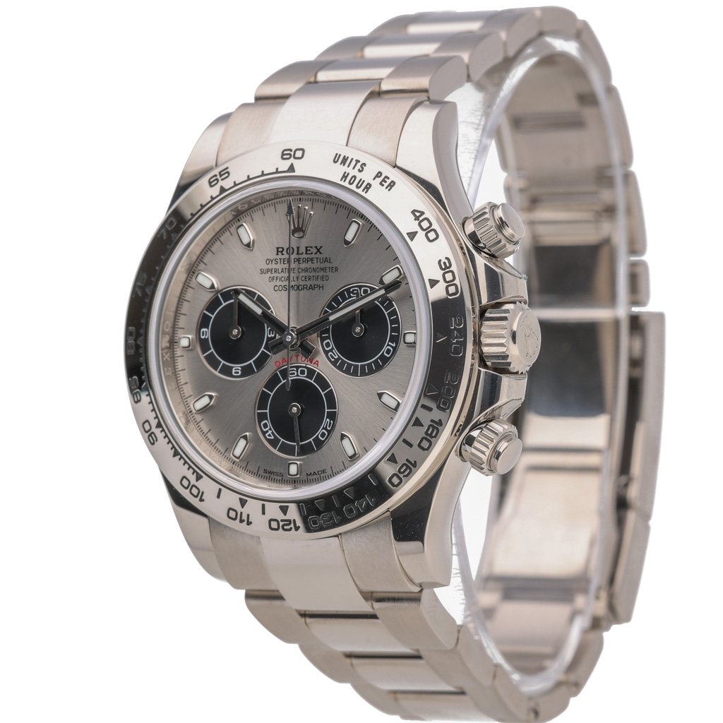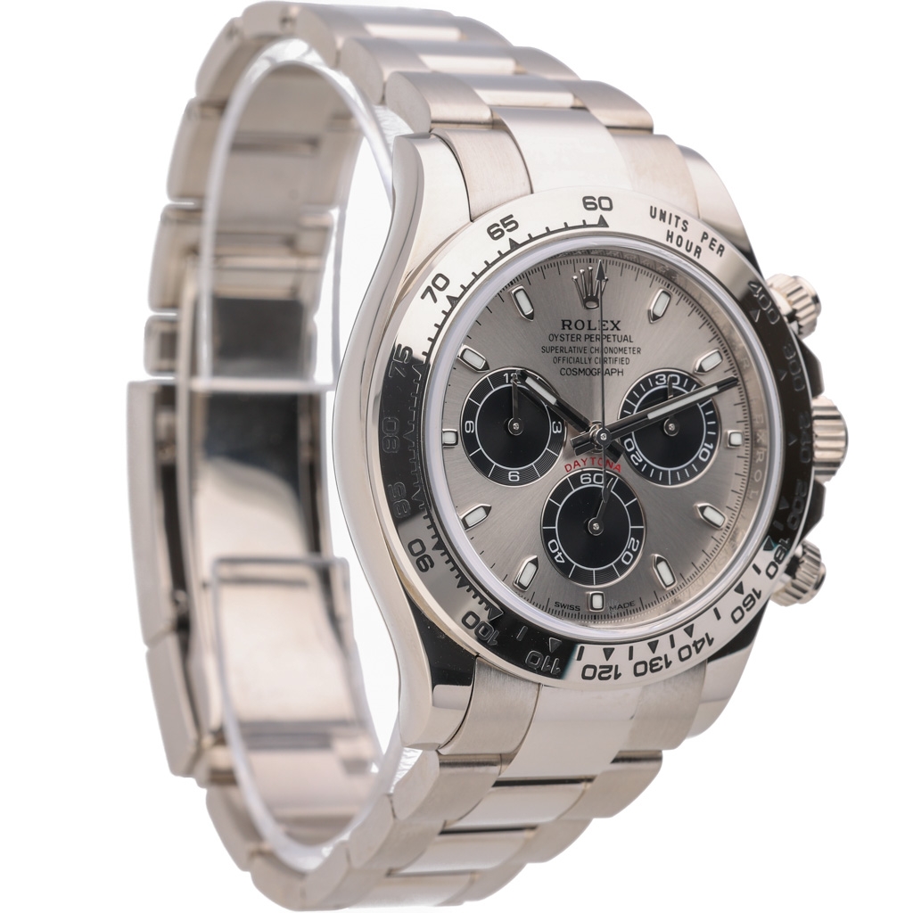 At its core lies the Rolex Calibre 4130 automatic chronograph movement — a self-winding mechanical calibre developed and manufactured entirely in-house. With its column wheel, vertical clutch, and 72-hour power reserve, the movement ensures flawless chronograph performance and precision worthy of its Superlative Chronometer certification. The engraved tachymetric bezel and solid Oyster bracelet complete the design, offering both durability and refined comfort.