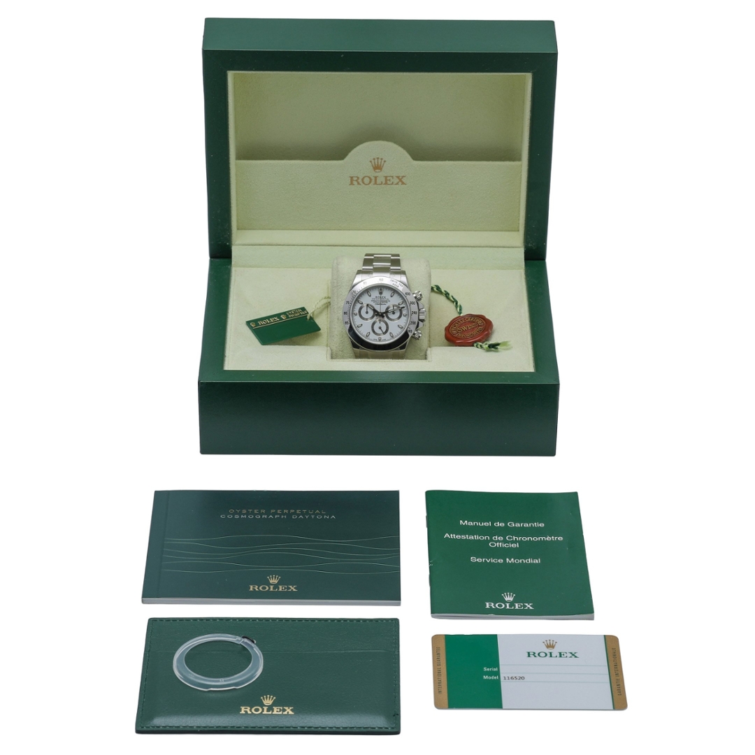 This 2015 example is presented in immaculate condition and comes complete with its original Rolex box, a full set of paperwork (a mix of pre- and post-2015 documents), and accessories — including the original black caseback sticker — further attesting to its authenticity. Supported by a 12-month WLC warranty, it offers complete assurance to its next owner. The Rolex Daytona 116520 with a white APH dial remains a truly iconic, investment-worthy timepiece — celebrated for its rarity, precision, and timeless appeal.