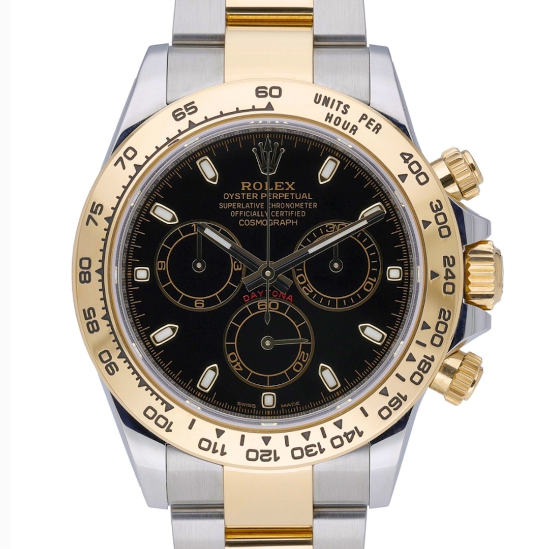 A Rolex Daytona 116503 is presented in a bi-metal combination of stainless steel and 18ct yellow gold, paired with a black dial that highlights the model’s balanced chronograph layout. A yellow-gold tachymeter bezel complements the 40mm Oyster case, while luminous hour markers and contrasting sub-dials ensure clear readability. The combination of steel and gold lends the watch a refined yet purposeful presence on the wrist.