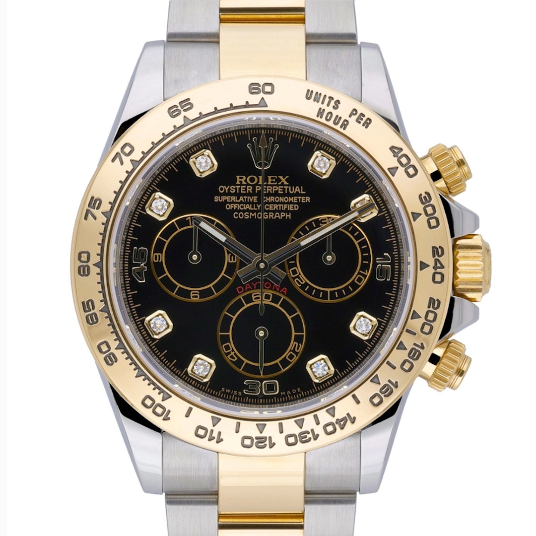 A Bi-Metal Rolex Daytona Watch, Stainless Steel and 18ct Yellow Gold with a Black Original Diamond Dial.