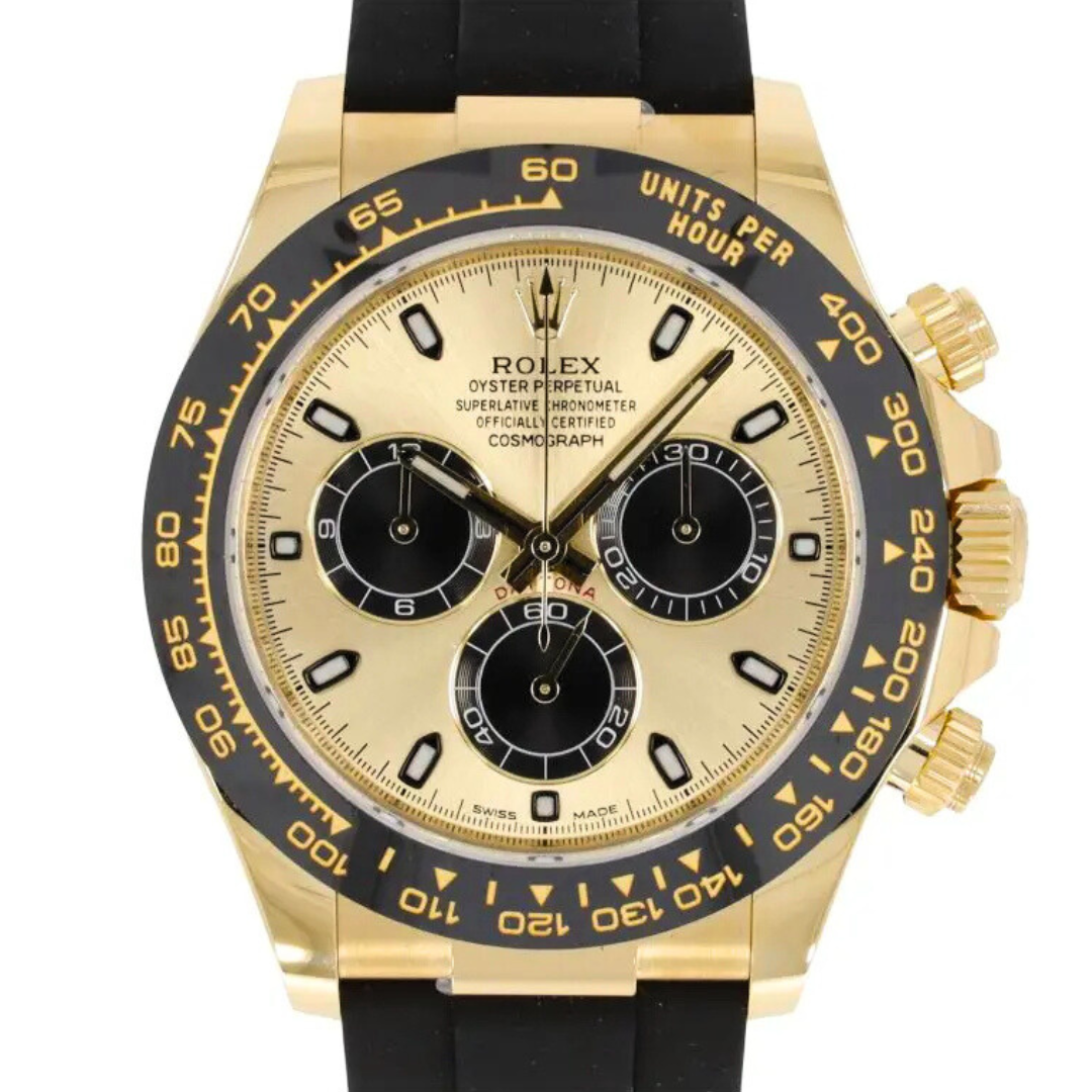 A Rolex Daytona Watch, 18ct Yellow Gold Case & Clasp with a Black Rubber Strap and a Black Bezel on a Champagne Dial.