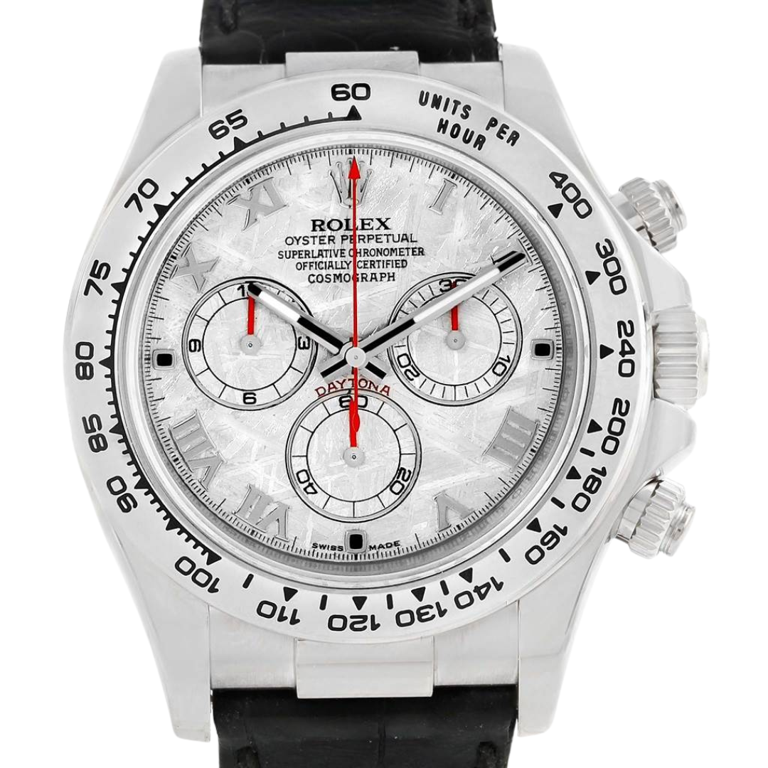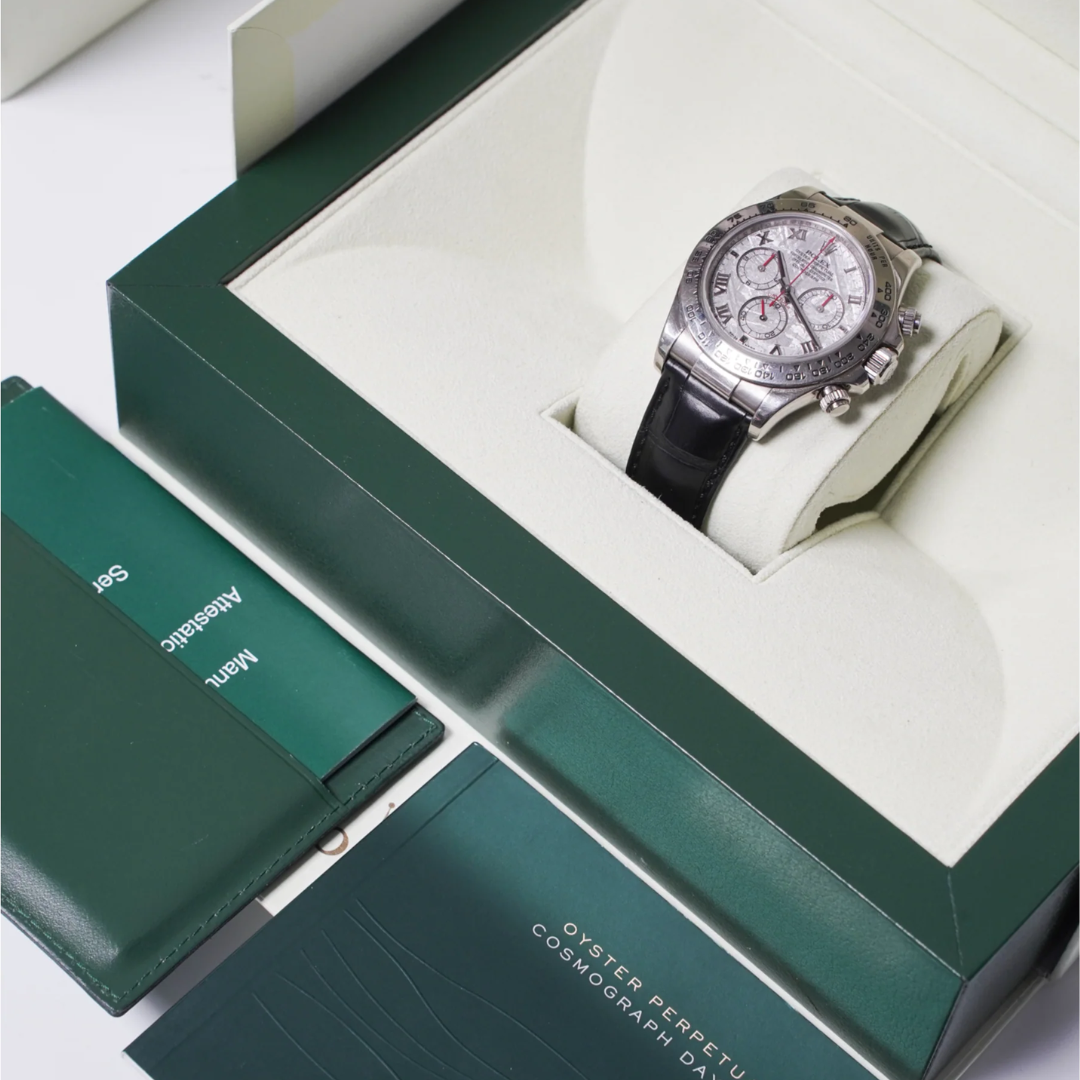 This Rolex Daytona 116519 represents one of the most compelling modern precious-metal Daytonas, pairing an 18ct white gold case with the highly coveted meteorite dial. Each meteorite dial is naturally unique, formed from an extraterrestrial iron-nickel structure, making no two examples identical and adding a genuine rarity factor that continues to attract long-term collectors.
