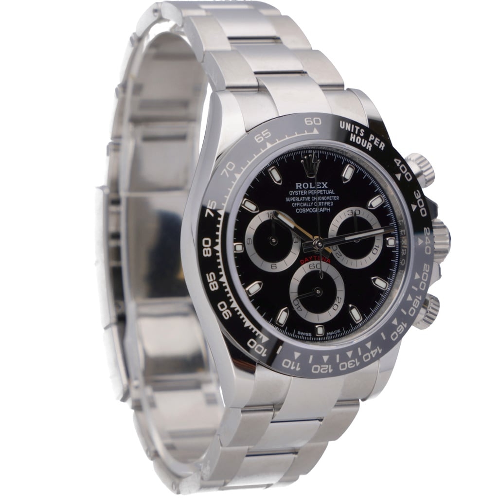A Rolex Daytona Watch, Stainless Steel with a Black Bezel and Dial.