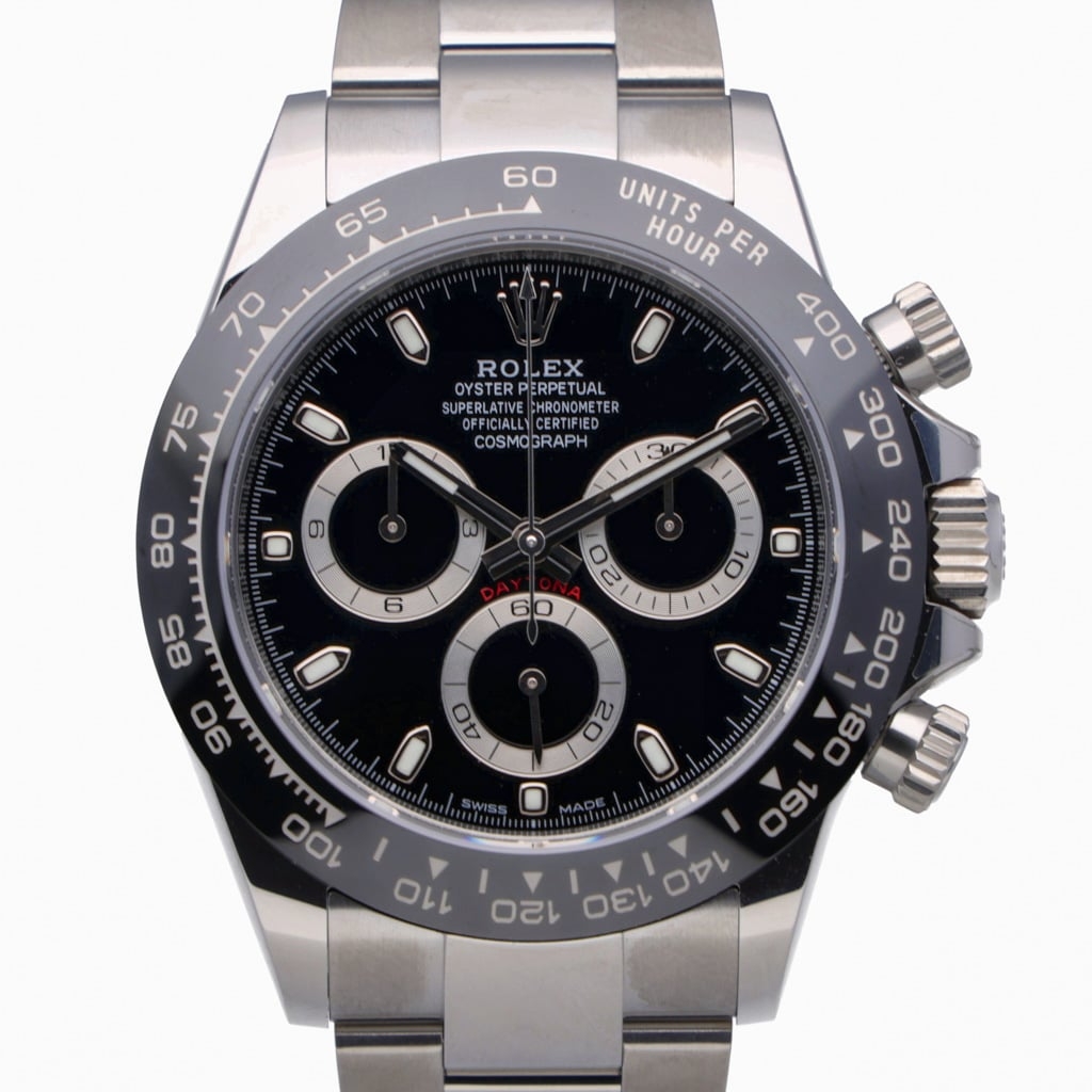 A Rolex Daytona is one of the most sought-after modern chronographs, presented in stainless steel with a black Cerachrom bezel and matching black dial. The 40mm Oyster case offers perfectly balanced proportions, combining sporty presence with refined finishing. The dial layout is clean and instantly recognisable, featuring contrasting chronograph sub-dials, luminous hour markers, and polished hands, while the engraved tachymeter bezel reinforces the Daytona’s motorsport heritage.