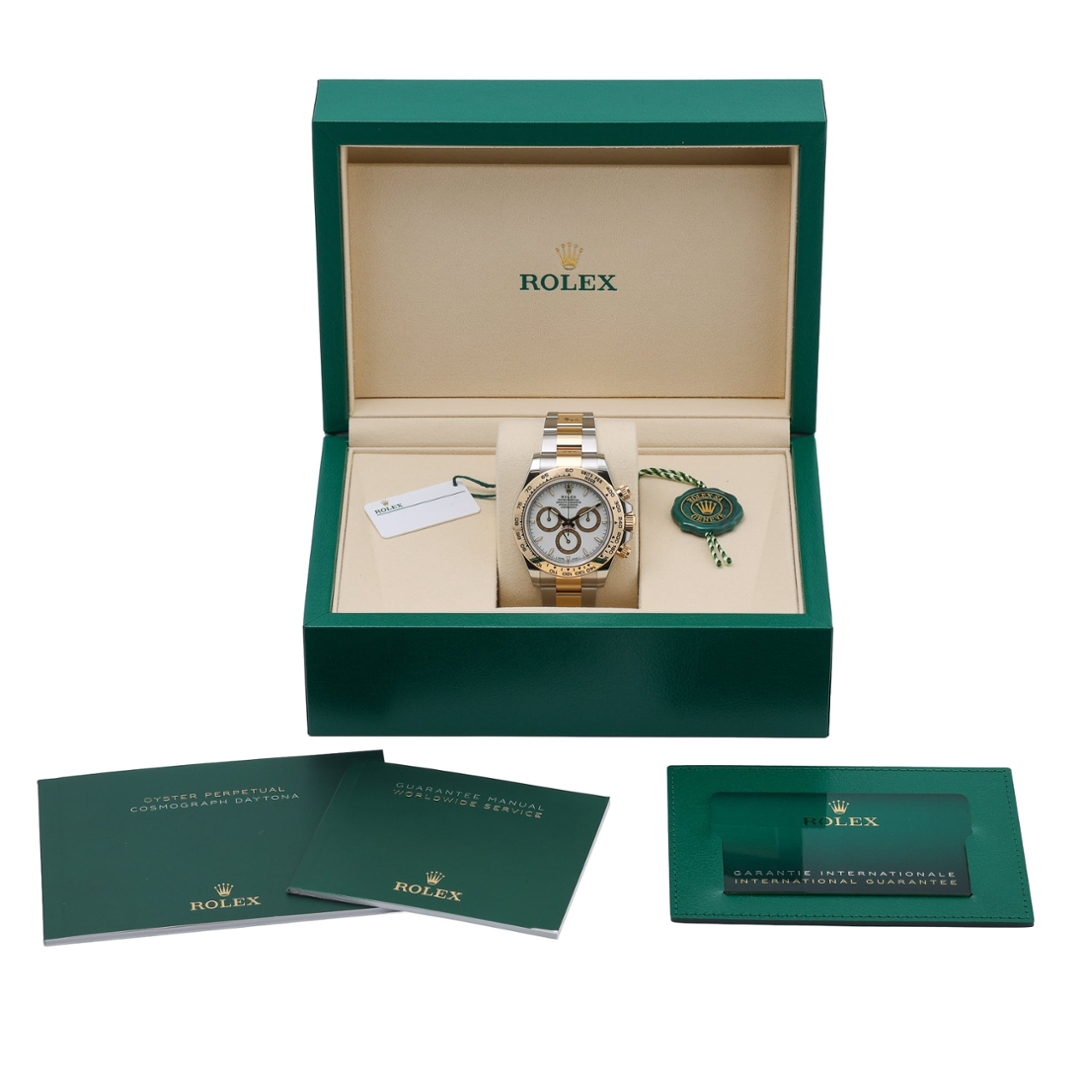 This 2026 example is offered as a full set, complete with original Rolex box and paperwork, and benefits from Rolex manufacturer warranty coverage through to 2031. A highly desirable modern Daytona blending precious metal, steel, and cutting-edge movement technology.