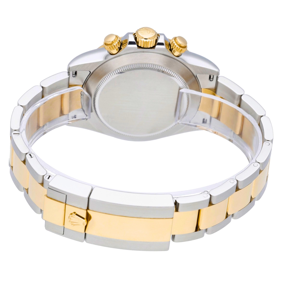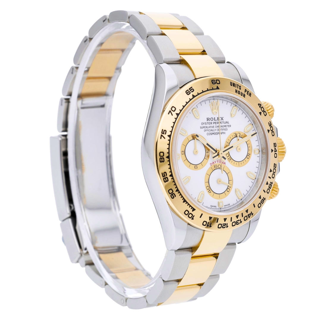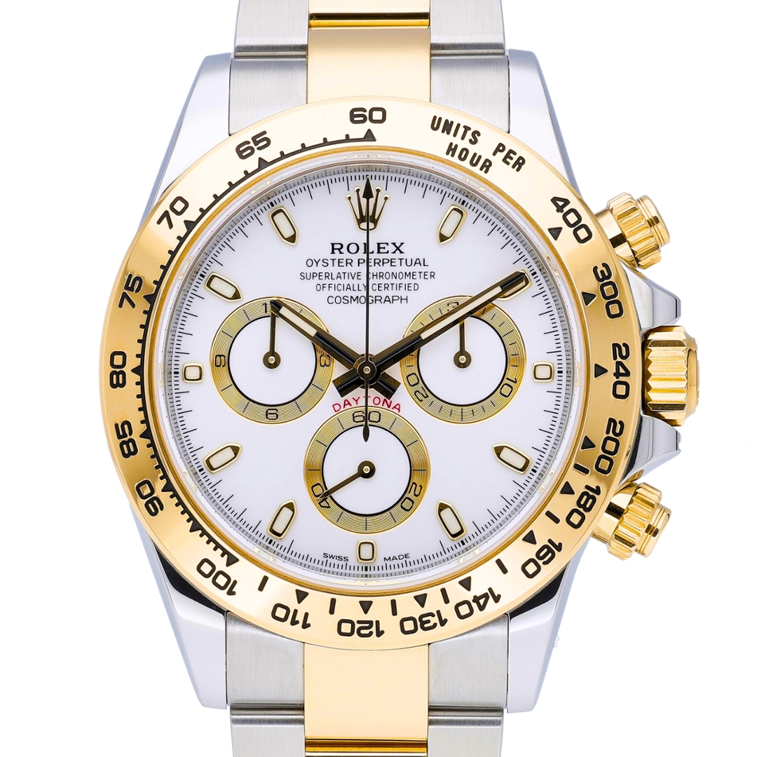 A bi-metal Rolex Cosmograph Daytona is presented in stainless steel and 18ct yellow gold, combining Rolex’s most celebrated chronograph design with enduring two-tone appeal. The 40mm Oyster case is fitted with a fixed yellow gold tachymeter bezel and paired with an Oyster bracelet featuring yellow gold centre links, creating a balanced mix of sport and luxury. The white dial offers excellent legibility, accented by gold-ringed sub-dials, applied baton hour markers, and the iconic red “Daytona” signature above the running seconds register.