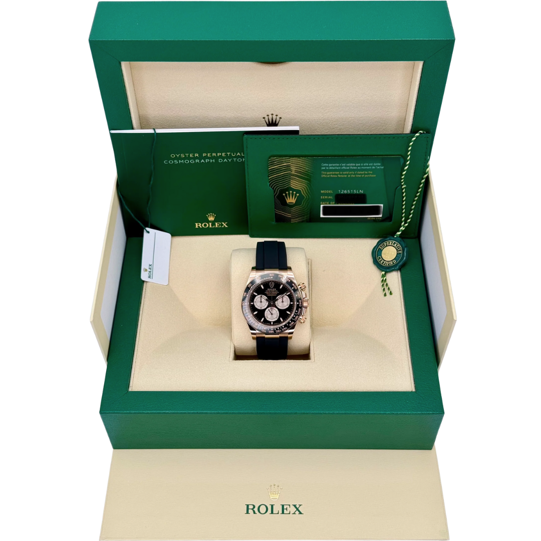 This 2025 Rolex Daytona reference 126515LN is presented in immaculate condition and features a full 18ct Everose gold case paired with a black Cerachrom tachymeter bezel. The 40mm case is complemented by the Oysterflex rubber strap with Everose gold clasp, delivering a balance of durability, comfort, and modern sport-luxury appeal. The black dial with contrasting sub-dials offers crisp legibility while maintaining the Daytona’s unmistakable, performance-driven aesthetic.