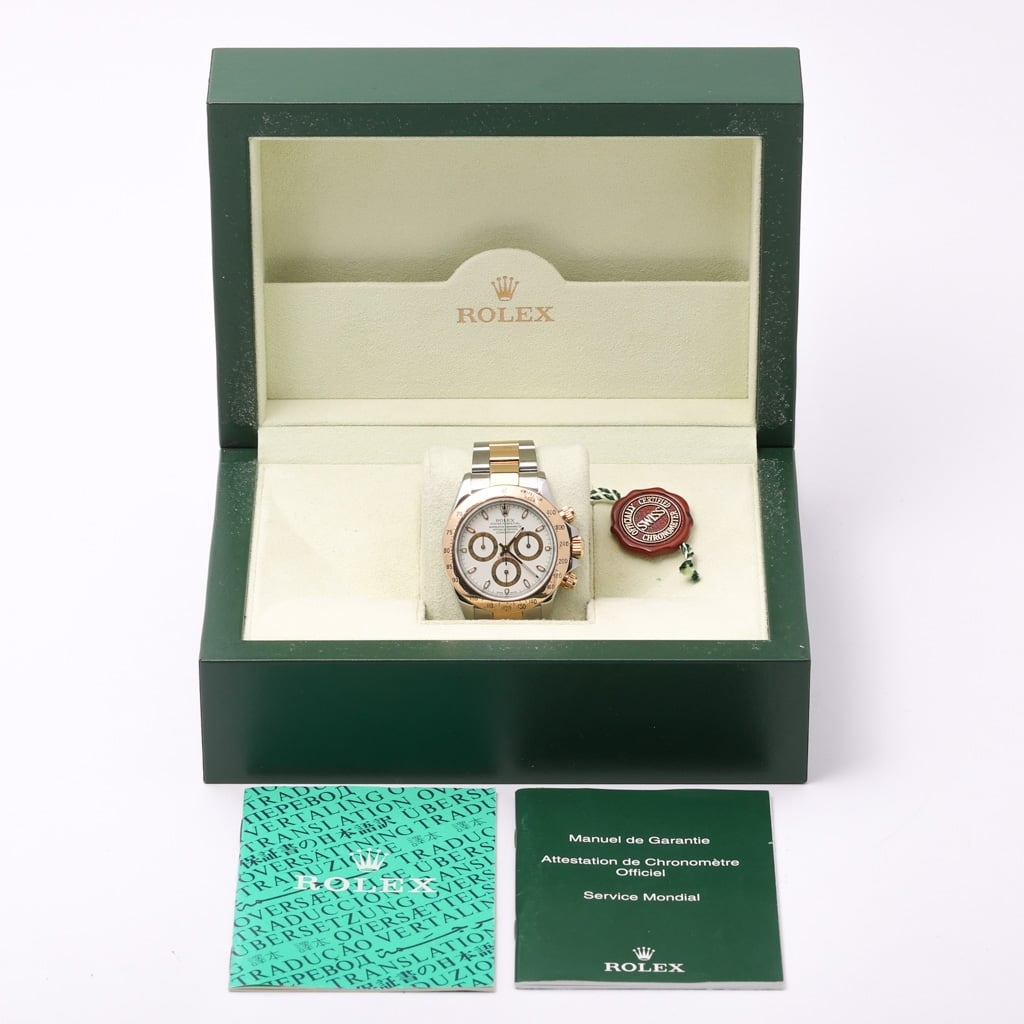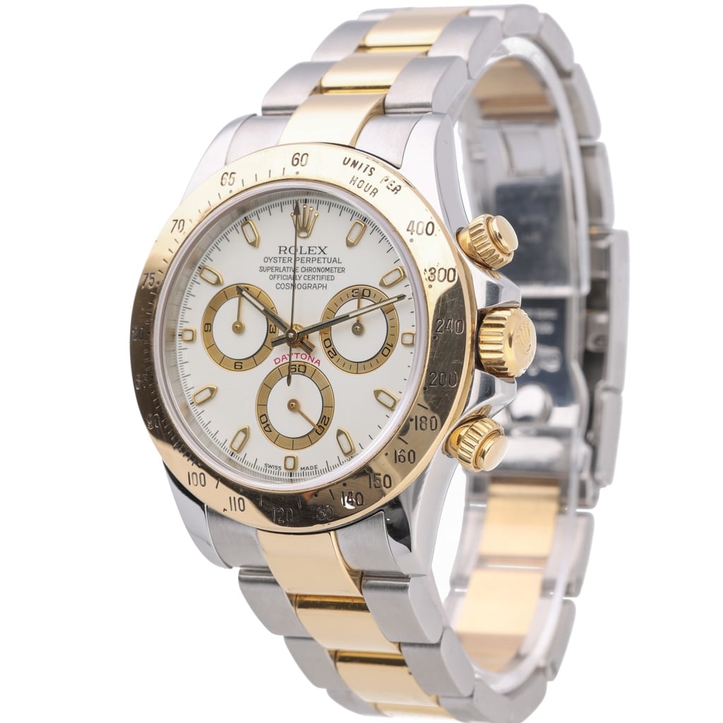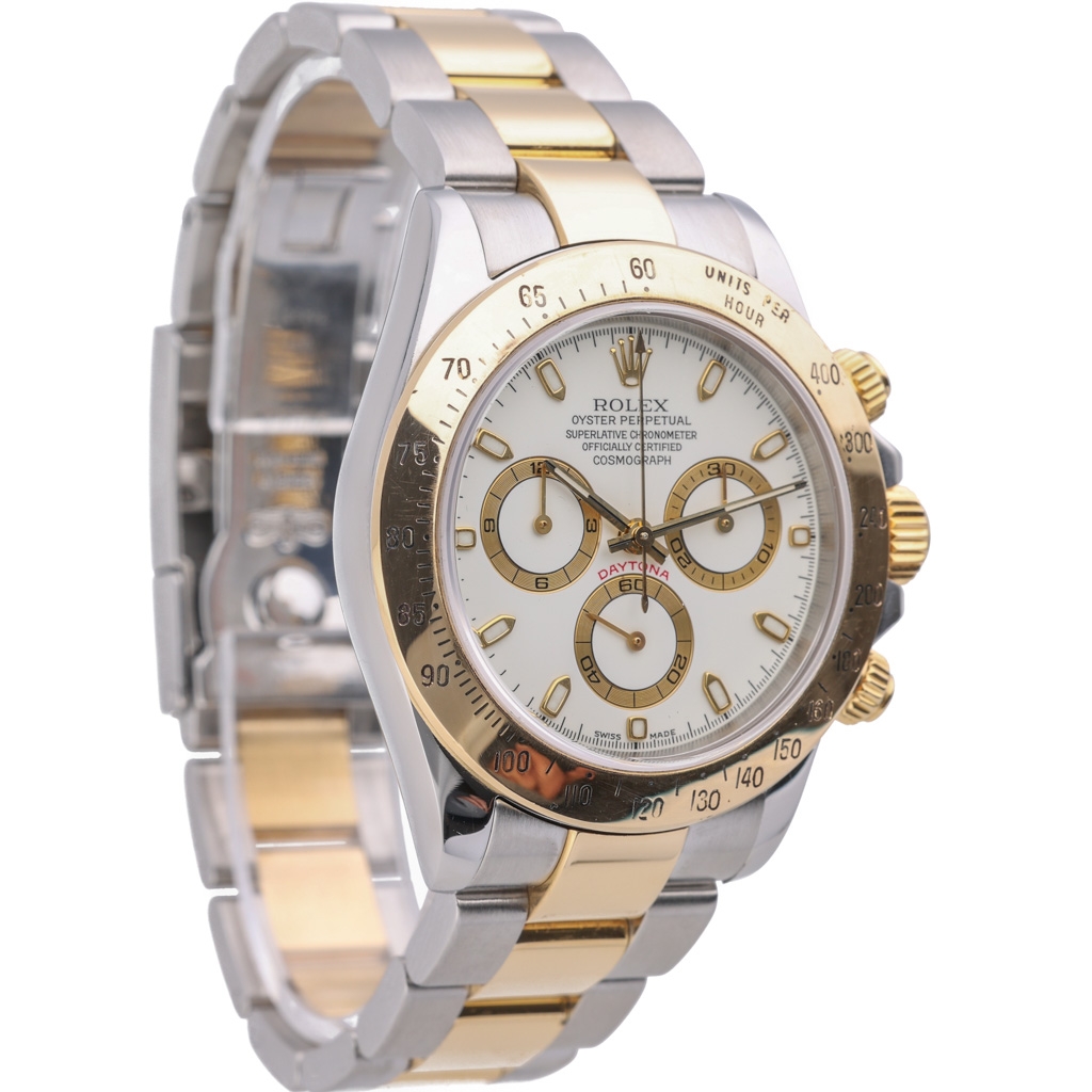 This bi-metal Rolex Daytona reference 116523 is a highly desirable example of one of Rolex’s most iconic chronographs, combining stainless steel with 18ct yellow gold and finished with a clean white dial. The 40mm Oyster case and fixed tachymeter bezel deliver the unmistakable Daytona profile, while the two-tone configuration adds a stronger luxury presence compared to its stainless steel counterparts.