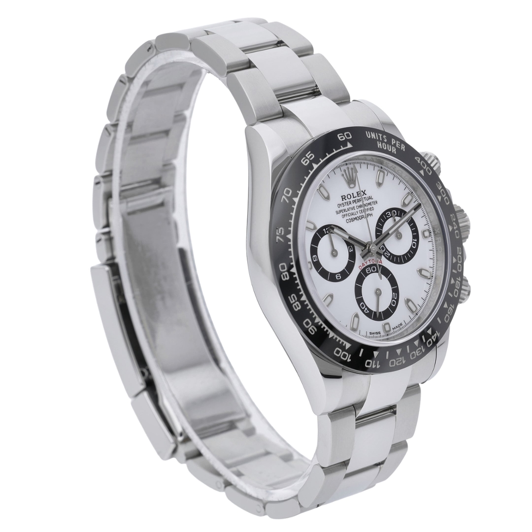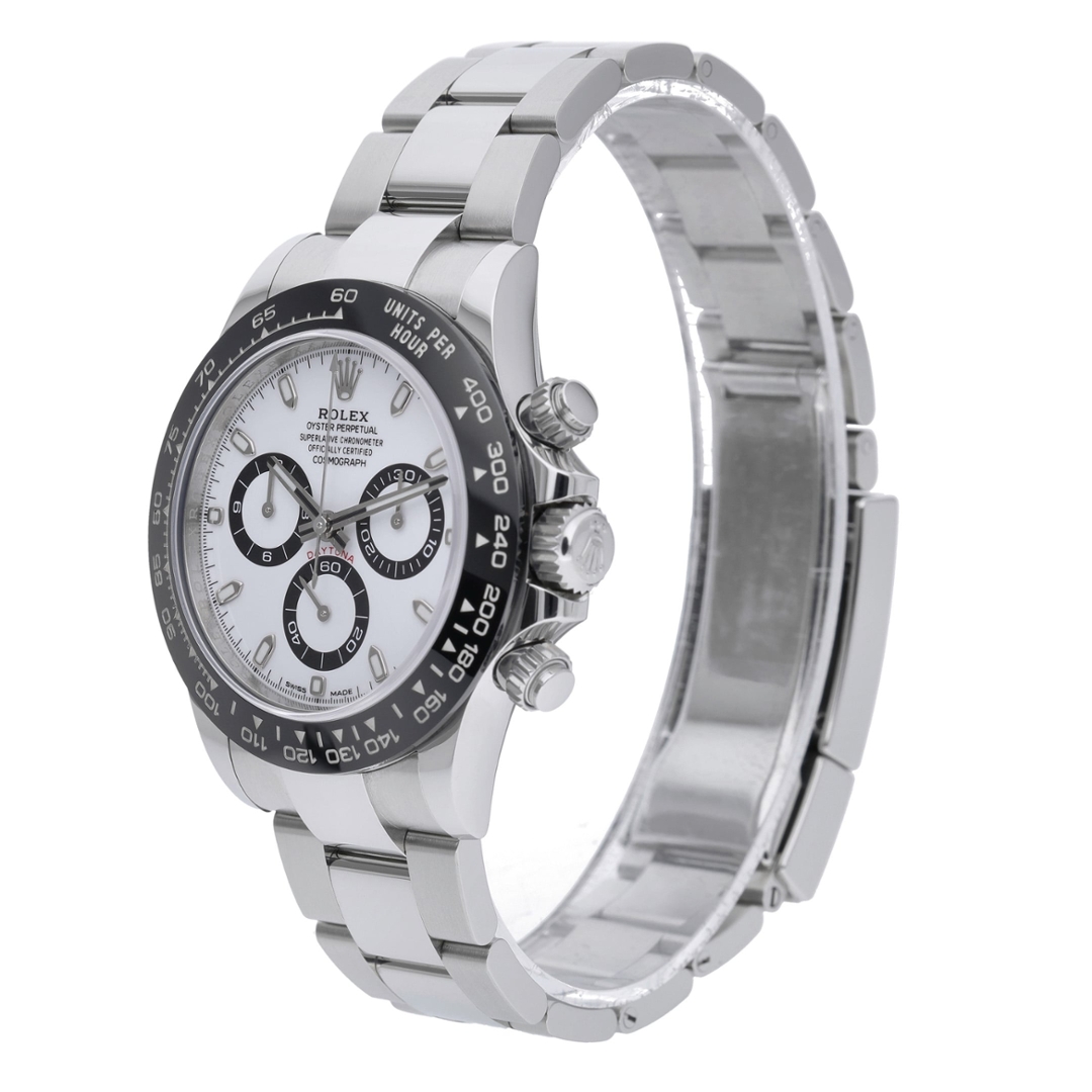 A Rolex Daytona Watch, Stainless Steel with a Black Bezel on a White Dial