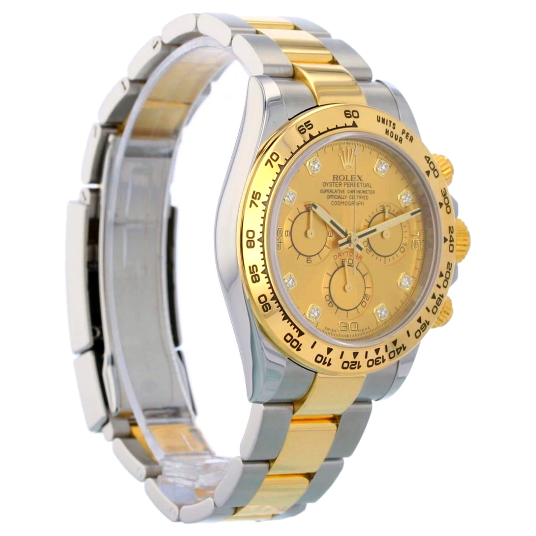 This Rolex Daytona 116503 represents one of the most recognisable and liquid chronographs in the modern luxury market. Crafted in stainless steel and 18ct yellow gold, it features the iconic champagne dial set with original Rolex diamond hour markers, paired with the fixed yellow gold tachymeter bezel that defines the Daytona lineage.